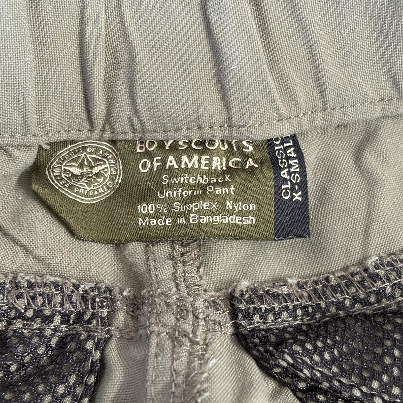 Brand: Boy Scouts of AmericaStyle: Switchback uniform pants with zip-off legs and cargo pockets.Color: Olive green.Size on tag: Classic X-Small (XS) boys.Material: 100% Supplex nylon woven fabric; made in Bangladesh.Details: Front button and zip fly, integrated nylon belt with plastic buckle at waist, belt loops, partial elastic back waistband, two front hand pockets, two rear flap pockets, dual cargo pockets at thighs, zip-off knees to convert to shorts, and mesh interior panels for breathability.Design: Boy Scouts of America logo on waistband buckle and interior label, solid green uniform styling suitable for scouting activities and outdoor wear.Condition notes: Some wear from use with a small mark on one leg as shown in photos.