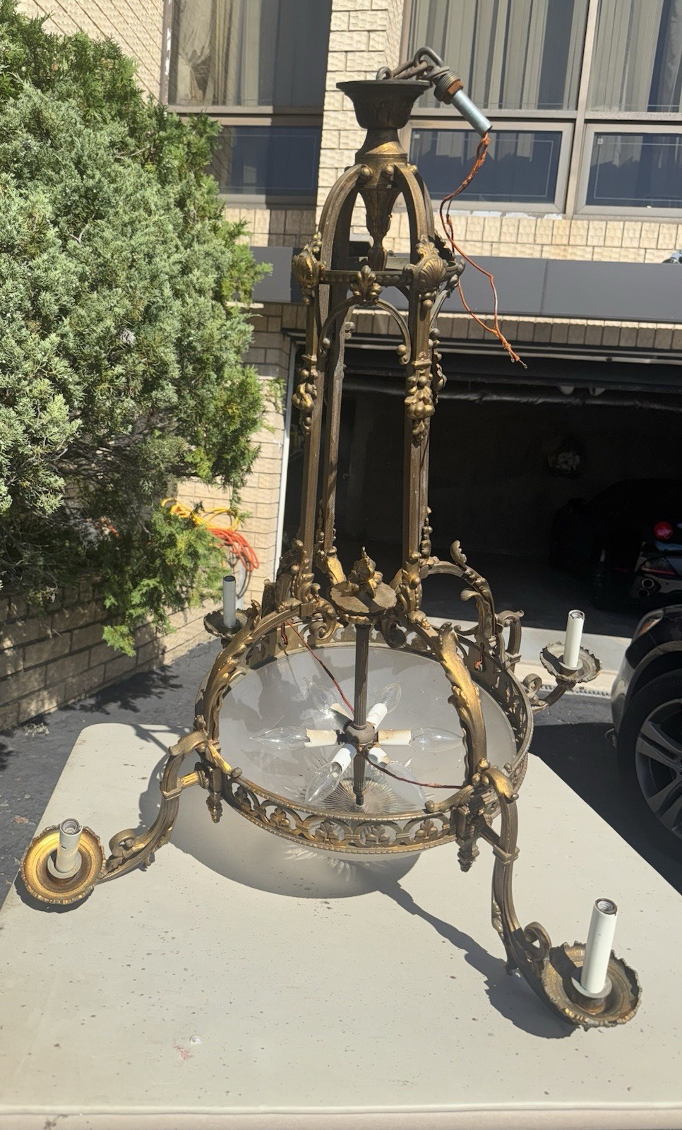 Yes, I can ship, message me for a quote. Ideally for local pick up.Antique Estate Beautifully Ornamented 19th Century French Brass Chandelier. Needs to be rewired but otherwise in good / nice condition. 10 light in total, one bulb on each of the four arms. 6 bulbs in the center of the chandelier. Measures Approximately: 25” W x 25” D x 35” H more or less. Measures approximately 25” inches in diameter from one arm across to another arm. The glass bowl on the bottom of the chandelier measures approximately 16.5” in diameter. Comes as pictured and described.*no, one of the arms is not bent, its just the angle of the photo that makes it look like that