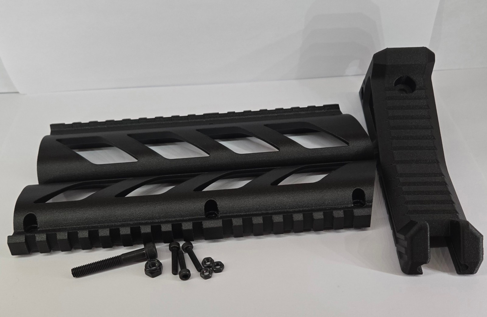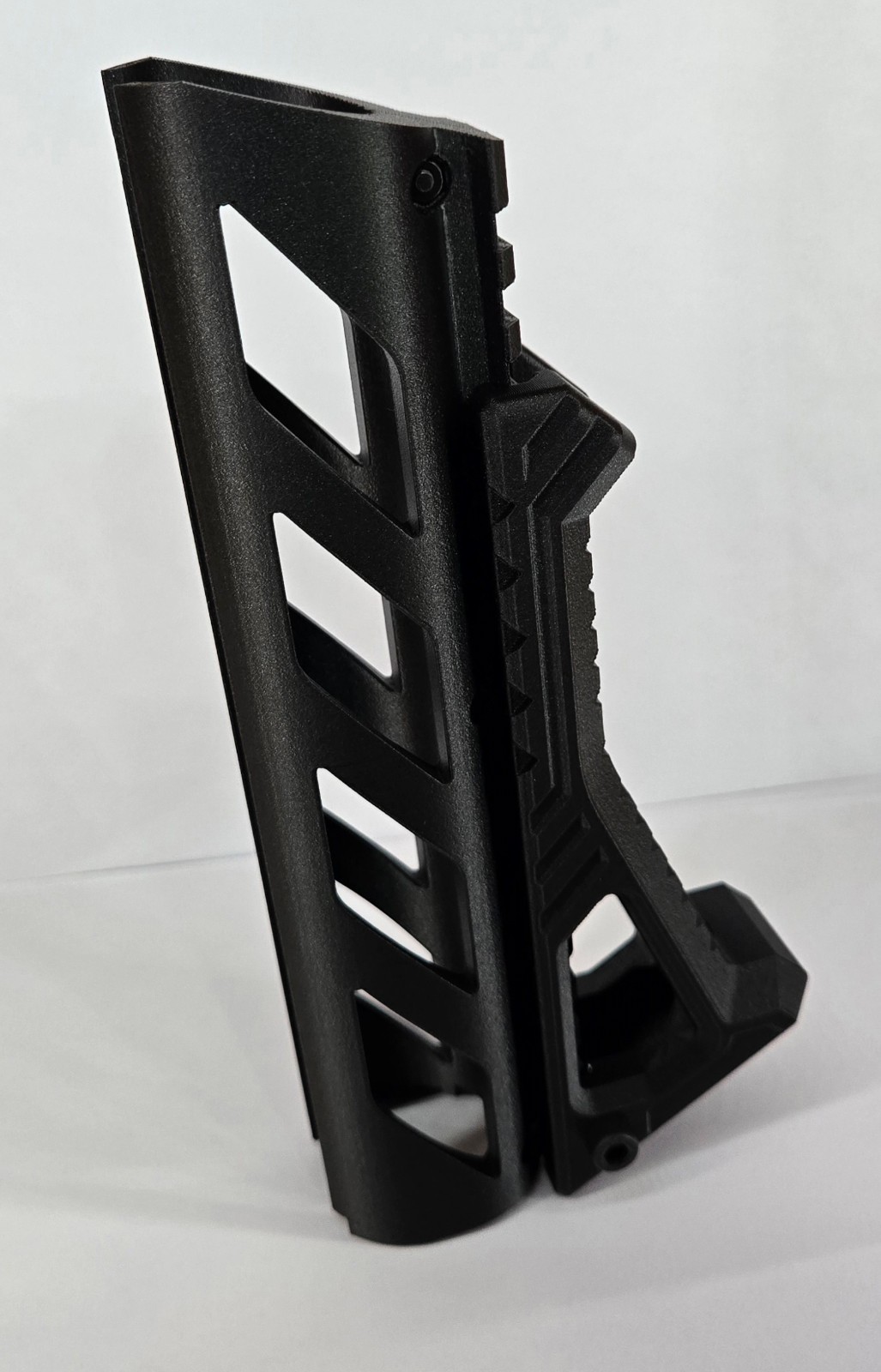 Air Tube Cover & Angled Foregrip Professional-grade, lightweight modular foregrip and tube cover — precision printed from CF PETG with integrated dovetail rail. Two-piece design screws together for a secure fit. Key Features Lightweight construction — carbon-fiber reinforced PETG (CF PETG) for excellent strength-to-weight ratio. Integrated dovetail rail for accessory mounting (fits standard dovetail interface). Two-piece design: two halves screw securely together for easy installation and removal. Ergonomic angled foregrip for improved control and natural wrist angle. Durable finish — resists scratches and wear under normal use. Specifications