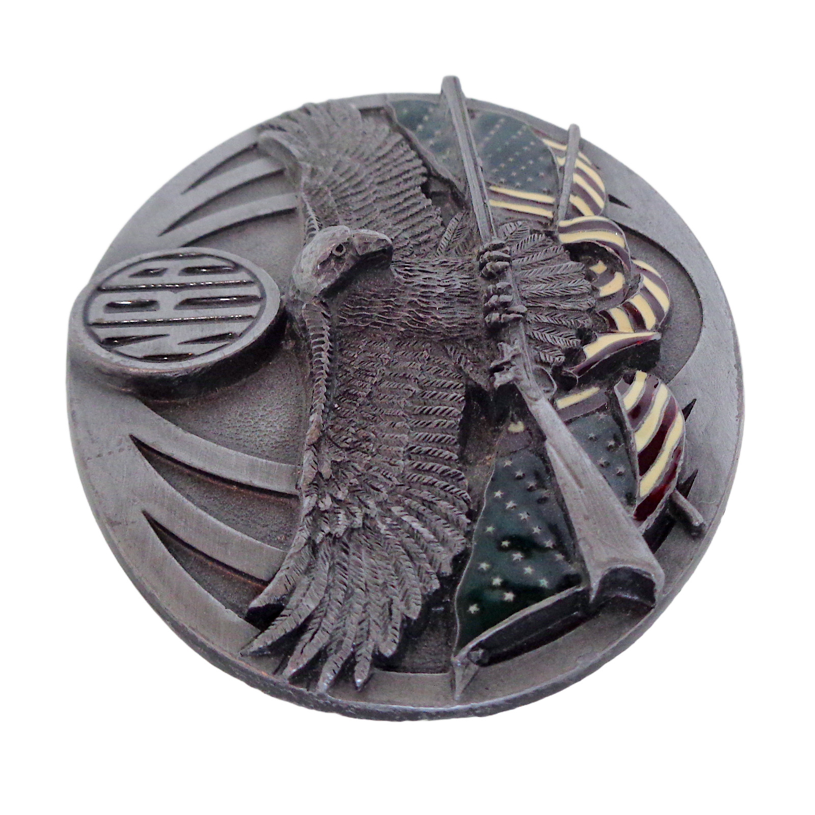 This NRA Bergamot pewter belt buckle from 1995 features an eagle, rifle, and flag design. It is a used vintage item in good condition with no visible wear or flaws. Ideal for collectors or for adding a statement accessory to casual outfits. Free shipping is included; check the listing for details on handling time, carrier, and any return terms.