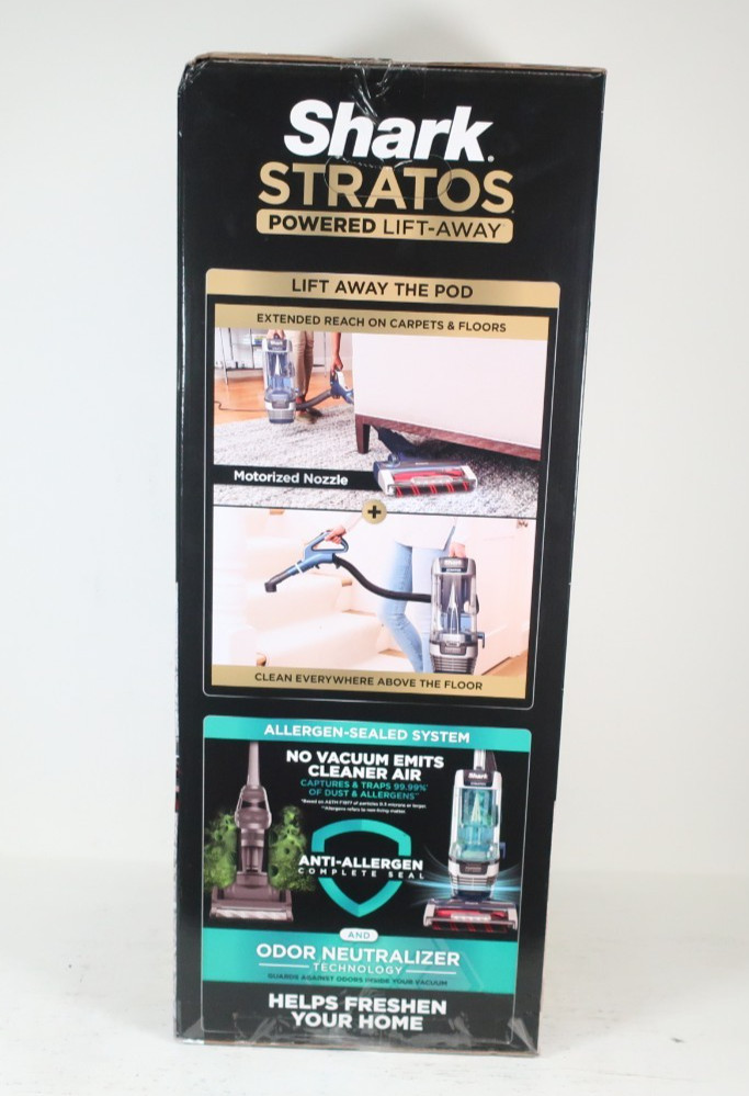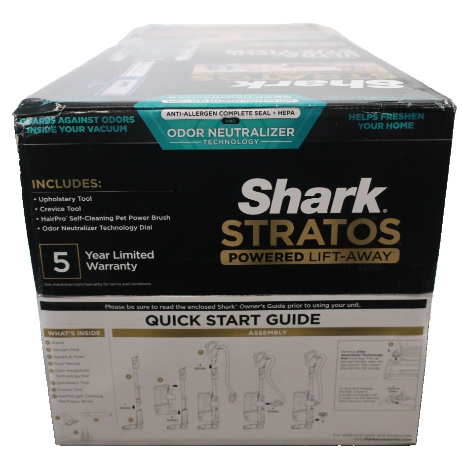 Brand new, factory-sealed Shark Stratos Powered Lift-Away Upright Vacuum (Model AZ3002).Top-tier Shark model featuring HyperVelocity® suction, DuoClean® PowerFins HairPro™, odor neutralizer technology, and a powered lift-away canister for whole-home cleaning. Ships fast & free from a Top Rated Plus seller.Key Features • Model: Shark Stratos AZ3002 • Powered Lift-Away: Detach canister for portable cleaning • HyperVelocity® Suction: Ultra-powerful airflow for deep cleaning • PowerFins HairPro™: Captures long, short & pet hair with no wrap • DuoClean® Technology: Two brushrolls for carpets + hard floors • Self-Cleaning Brushroll: No hair wrap, low maintenance • Odor Neutralizer Technology: Helps reduce & prevent odors • Anti-Allergen Complete Seal + HEPA Filter • 1300W / 120V / 60Hz • 5-Year Limited Warranty from SharkWhat’s Included✔️ Vacuum Pod✔️ Wand✔️ Handle & Hose✔️ DuoClean PowerFins Floor Nozzle✔️ Odor Neutralizer Technology Dial✔️ Upholstery Tool✔️ Crevice Tool✔️ HairPro™ Self-Cleaning Pet Power Brush✔️ Factory-sealed retail boxCondition✔️