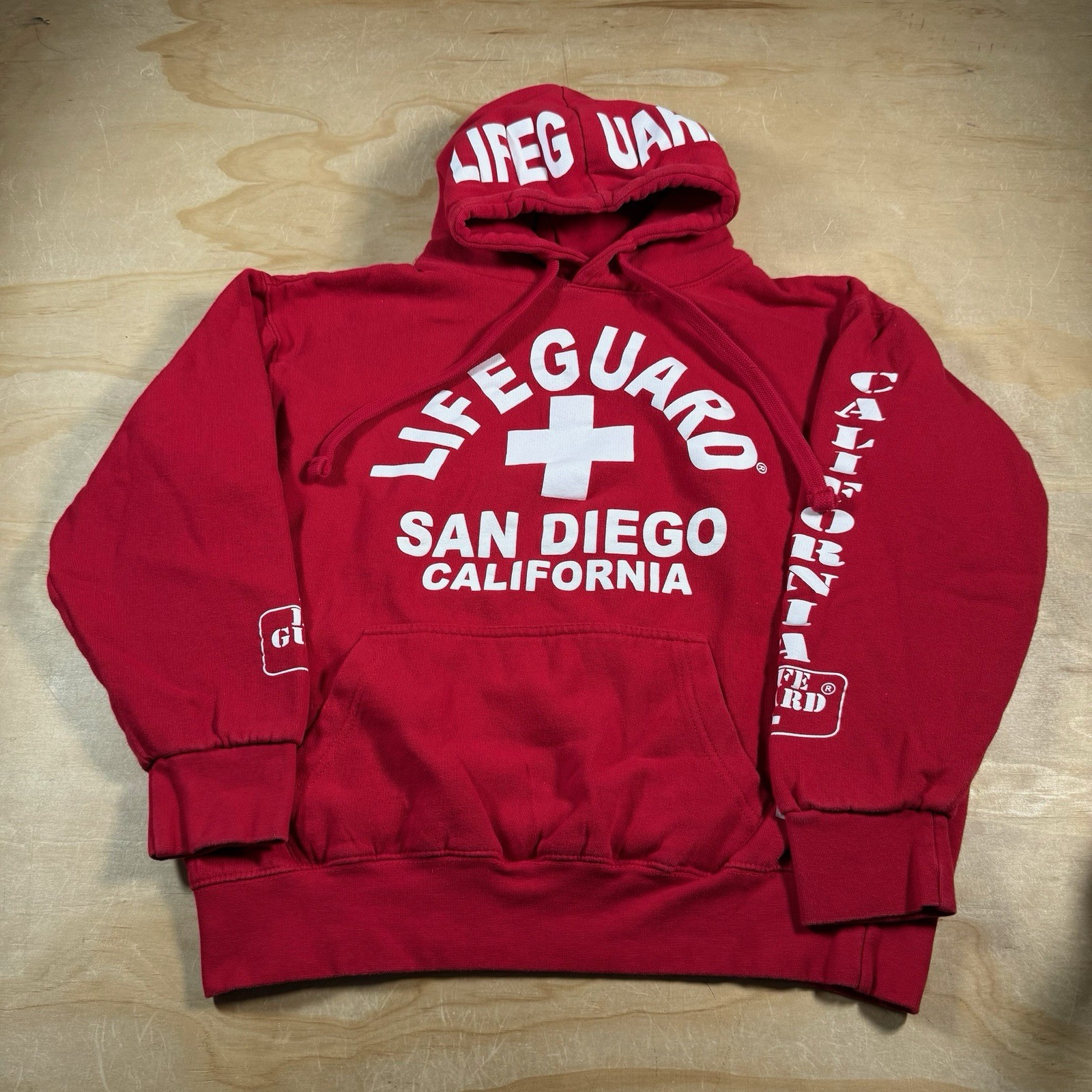 This Lifeguard adult medium hoodie sweatshirt in red features long sleeves and a San Diego, California theme. It is pre-owned in good condition and priced for an affordable replacement or casual everyday wear. Please review the listing photos and description for the most accurate details on fabric, measurements, fit, and any signs of wear, as specifics are not provided here. Free shipping is included, so you can expect no added delivery cost at checkout. Check the listing for details.