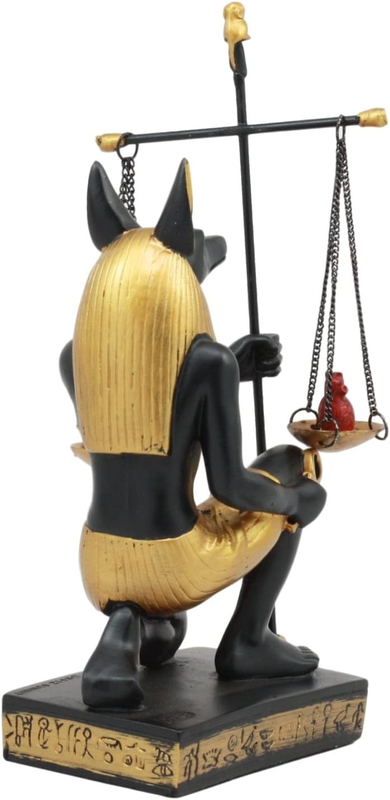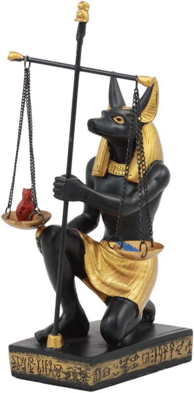This Kneeling Anubis With Justice Scales Statue measures approximately 7.5" Tall (Base to Top of Scale) or 6.5" (Base to ear). He is 4" wide and 3.5" deep approximately.This Kneeling Anubis With Justice Scales Statue is Made of durable composite resin, hand painted and polished individually.Anubis is the Greek name for a jackal-headed god associated with mummification and the afterlife in Egyptian mythology. The Ancient Egyptians believed that when you died, you travelled to the Hall of the Dead. There Anubis weighed your heart against the feather of an ostrich. Anubis is the Greek name for a jackal-headed god associated with mummification and the afterlife in Egyptian mythology. The Ancient Egyptians believed that when you died, you travelled to the Hall of the Dead. There Anubis weighed your heart against the feather of an ostrich.