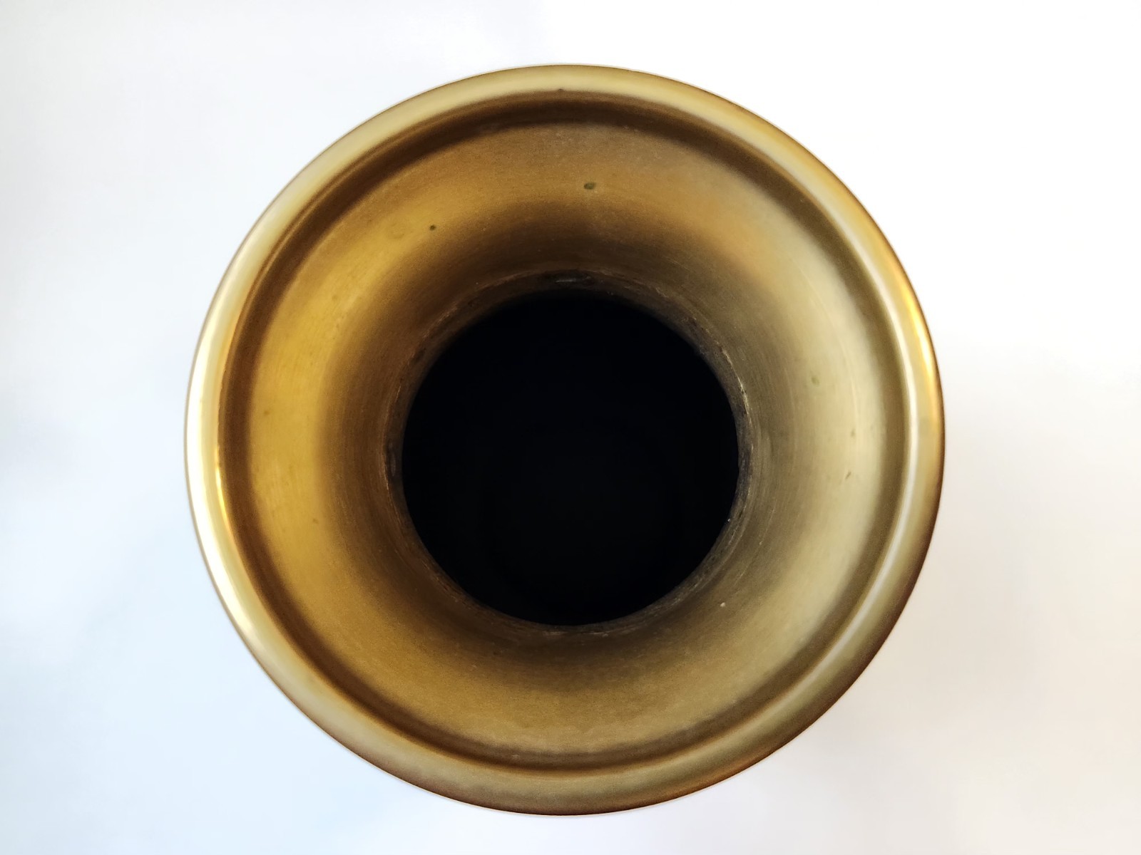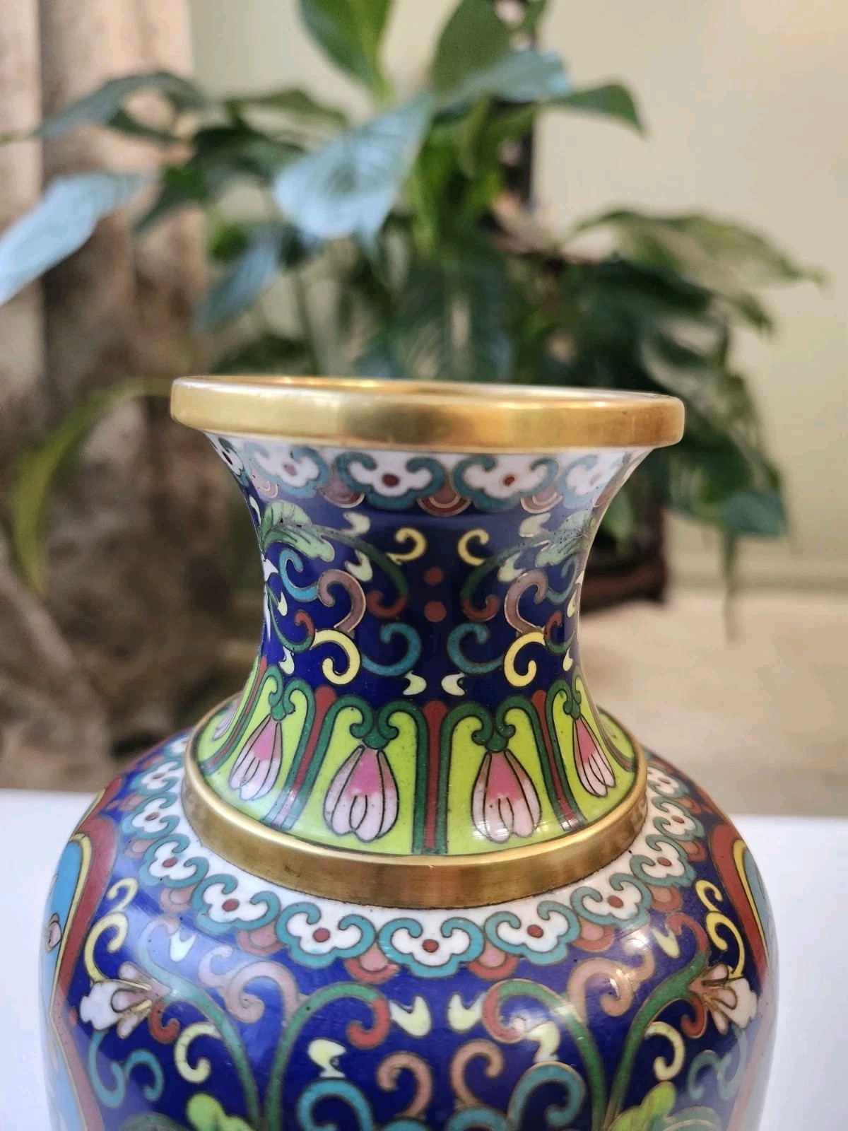 Vintage Chinese cloisonné enamel vase, likely 1950s–1970s. Deep cobalt blue ground with repeating cloud motifs, floral decoration, gold-tone rim and foot, and turquoise enamel base. Classic mid-century Chinese export cloisonné. Measurements: • Height: 7 1/2" • Mouth diameter: 2 3/4" • Base diameter: 2 1/2" Condition: Very good vintage condition with typical minor enamel imperfections from production. No major chips or cracks. Colors are bright and clean.