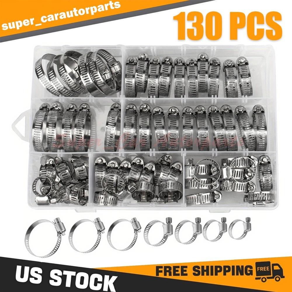 This new 130-piece adjustable worm gear hose clamp assortment set is designed for securing hoses and tubing in automotive and general repair applications. The set includes multiple clamp sizes, but exact size ranges and specifications are not provided—check the listing for details. Made from stainless steel (per the title), these clamps are intended to help achieve a firm, adjustable fit using a worm drive mechanism. Ships with free shipping. Condition: New. Price: 16.29 USD.