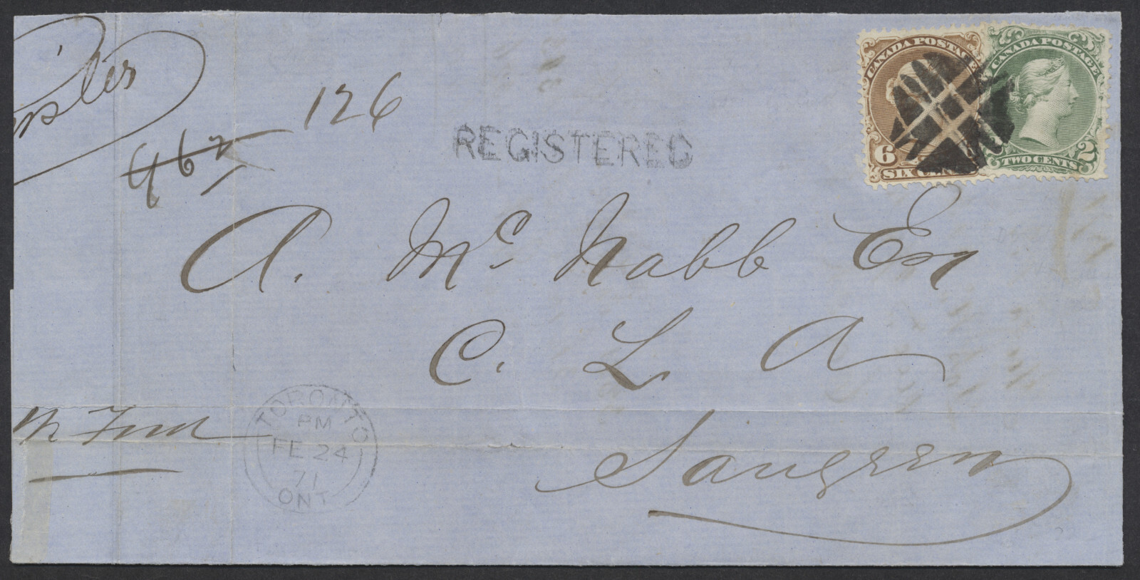 1871 Registered Cover Piece #24/#27a Stamp, Toronto to Saugeen