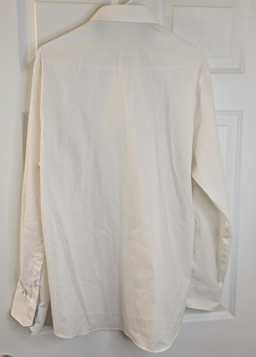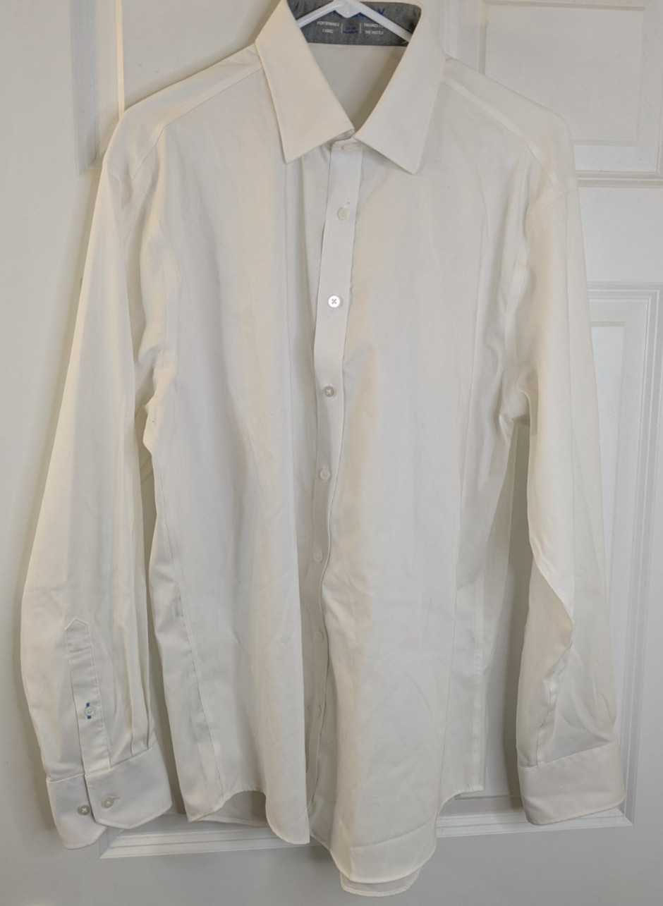 Twillory Performance Shirt, Men's, Dress Shirt, White, Size 17. Pit to pit 24 inches, shoulder to wrist 25.5 inches, shoulder to hem 30 inches.U85
