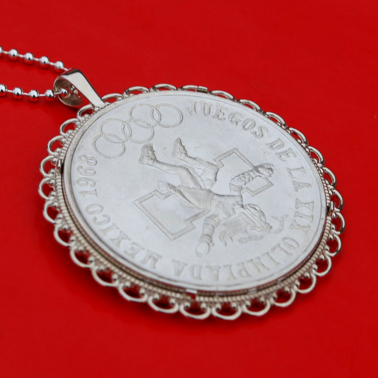 A gorgeous 925 sterling silver necklace, set with an authentic 1968 Mexico Olympic 25 Pesos Silver Coin Ley Silver Coin, showing OBVERSE in front - National Arms Eagle on Cactus Facing Left with Snake in Beak above Wreath. The coin bezel is well designed with classic scrolls, about 2"(50mm) x 1.7"(43mm), and made of solid 925 sterling silver. The coin is BU uncirculated, backside 4-prong set, and you can see both sides of the coin. I designed and made this pendant myself, which is a brand new one and has never been worn or used before. It comes with a 24" sterling silver chain and also a gift box, so the pendant is ready to wear when it arrives. I hope you end up with one of these beautiful world coin necklaces. This necklace will be great for gift, investment purpose or just adding to your coin/jewelry collection. I will be happy to combine shipment for multiple items. Let me know if you have any question. Thanks,
