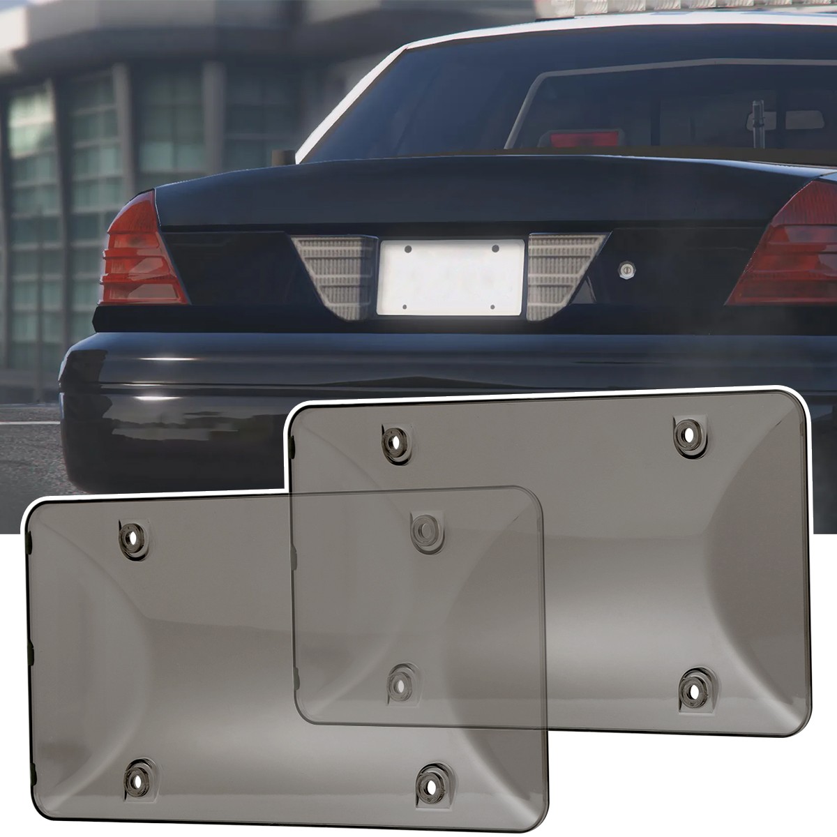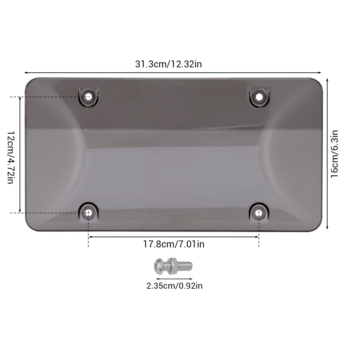 2pcs Licence Plate Frame Cover Bubble Lens Universal For Car Truck WaterproofFEATURE:【2-Pack Value】: 2 license plate covers included, plus full hardware kit (8 screws, 8 nuts, 8 plastic washers, 8 silicone washers) for complete setup.【US Standard Fit】: 31.3cm×16cm size, matches US 31cm×16cm plates. 17.8cm long/12cm short hole spacing for perfect alignment.【Durable ABS Build】: Made of tough ABS material, resistant to weather and wear. Black/gray options to suit your car’s look.【Easy to Install】: Simple 4-step process – fits plate, secures with included hardware. No special tools required.【Protective Washers】: Plastic and silicone washers prevent scratches on your car and plate, keeping both in great shape. SPECIFICATION:Material: ABSColor: Black / GrayDimensions: 31.3cm * 16cmDistance Between Long Side Holes: 17.8cmDistance Between Short Side Holes: 12cmScrew Length: 2.35cmCompatible with: Standard US Vehicle Size: 31cm x 16cm INSTALLATION INSTRUCTIONS:1. Place the license plate into the license plate protector, ensuring it fits in all holes.2. Insert the screw through the plastic washer, through the hole, and tighten it onto the vehicle.3. Place the nut vertically on the plastic washer.4. Push the nut down firmly until it clicks into place. ITEM INCLUDED:License Plate Covers *2Screws *8Nuts *8Plastic Washers *8Silicone Washers *8Screws *8PaymentShipping & HandlingReturns PolicyContact USFeedbackPaymentShipping will be arranged only your payment is cleared.We accept payment by PayPal only.Shipping & HandlingWe ship the same business day if paid by 4pm EST(1pm PDT).We don't ship to APO/FPO and Post Office box addresses, Alaska, Hawaii and Puerto Rico.No shipping on Weekend or Public Holidays & No responsibility for any customs duty.Returns PolicyWe offer a 60 day money back guarantee or exchange.Buyer pays return shipping and we pay replacement shipping.If you want to initiate a return,please contact us to get a returning address before sending the item back.Contact USWe hope that every transaction can have a happy ending. And if you have any more problems, please feel freeeee to contact us. we'll do what we can to help. FeedbackWe believe communication can result in a happier ending before you leave a red or gray feedback. And this account is my baby. I do care about it and will do what I can to protect it.