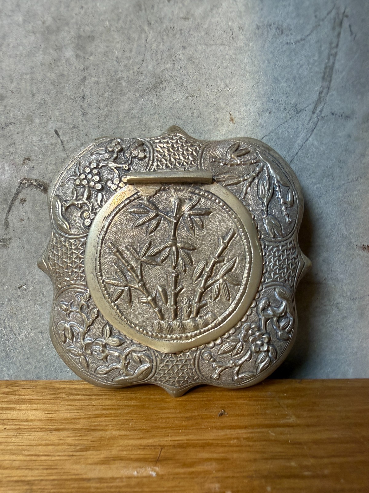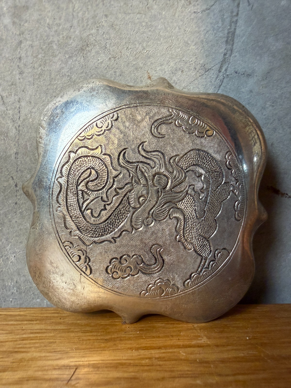 Striking vintage lidded trinket box with bold Asian-inspired relief work and a sculptural dragon medallion design. The exterior features detailed raised decoration with a softly aged silver-tone finish, while the interior is finished with a complementary engraved motif that adds to the presentation when opened. A great small accent piece for a desk, vanity, or cabinet—ideal for holding rings, coins, cufflinks, incense pellets, or other small keepsakes. The decorative dragon and bamboo-style imagery give it strong display appeal, whether used functionally or simply styled as an object. See photos for condition and dimensions. Reach out directly with any specific questions, and we’ll do our best to reply within 24 hours. Please check out our other listings for amazing estate items. Chinese style, dragon motif, lidded box, trinket box, vanity box, keepsake box, jewelry box, silver tone box, Asian decor, bamboo motif, chinoiserie, desk accessory, collectible box