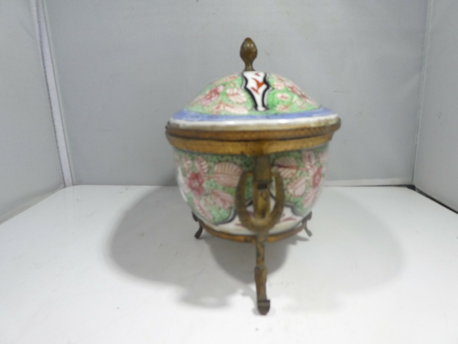 ANTIQUE FRENCH JAPONAISE STYLE IMARI COVERED DISH W BRASS FITTINGS