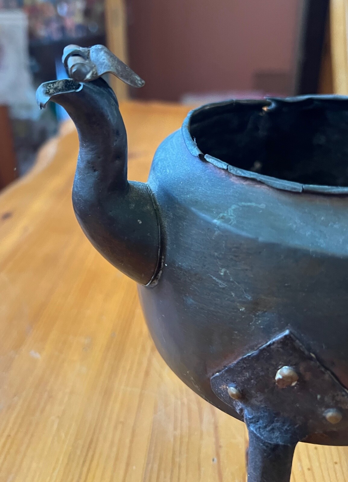 Very old Swedish or Scandinavian style tea kettle. I believe this is made of wrought iron. It could date as far back as the late 1700s. It was likely created by a Swedish immigrant blacksmith. It was used for a very long time as it shows much wear. There are several repairs including a copper plate attached to the bottom. No lid and a flap on the spout. Three foot pedestal legs. The real charm of this piece is the aged rustic look. It stands about 7" high. Length including handle is about 10". Not including handle is 4-5". A great piece for a country kitchen, restaurant or any place. Please see photos for details.
