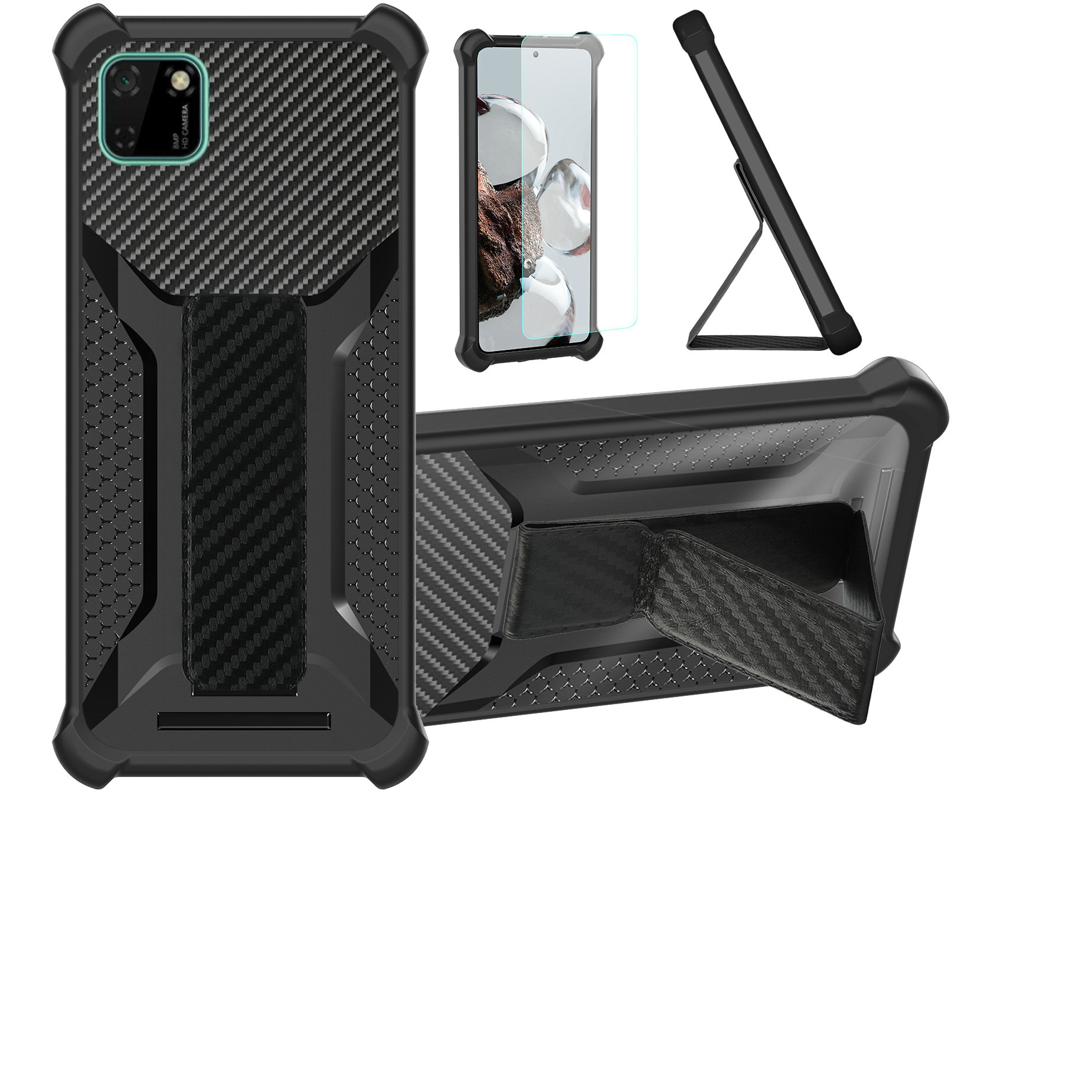 About this item Carbon fiber frosted back design prevents most fingerprints Soft silicone frame + hard PC back panel, hybrid material provides better protection. Thickened all-around protection, can protect the phone from 2 meters height drop without any damage. Folding stand can provide multi-angle support, more convenient to use Comes with 1* tempered glass screen protector, saving you the cost of purchasing a screen protector.