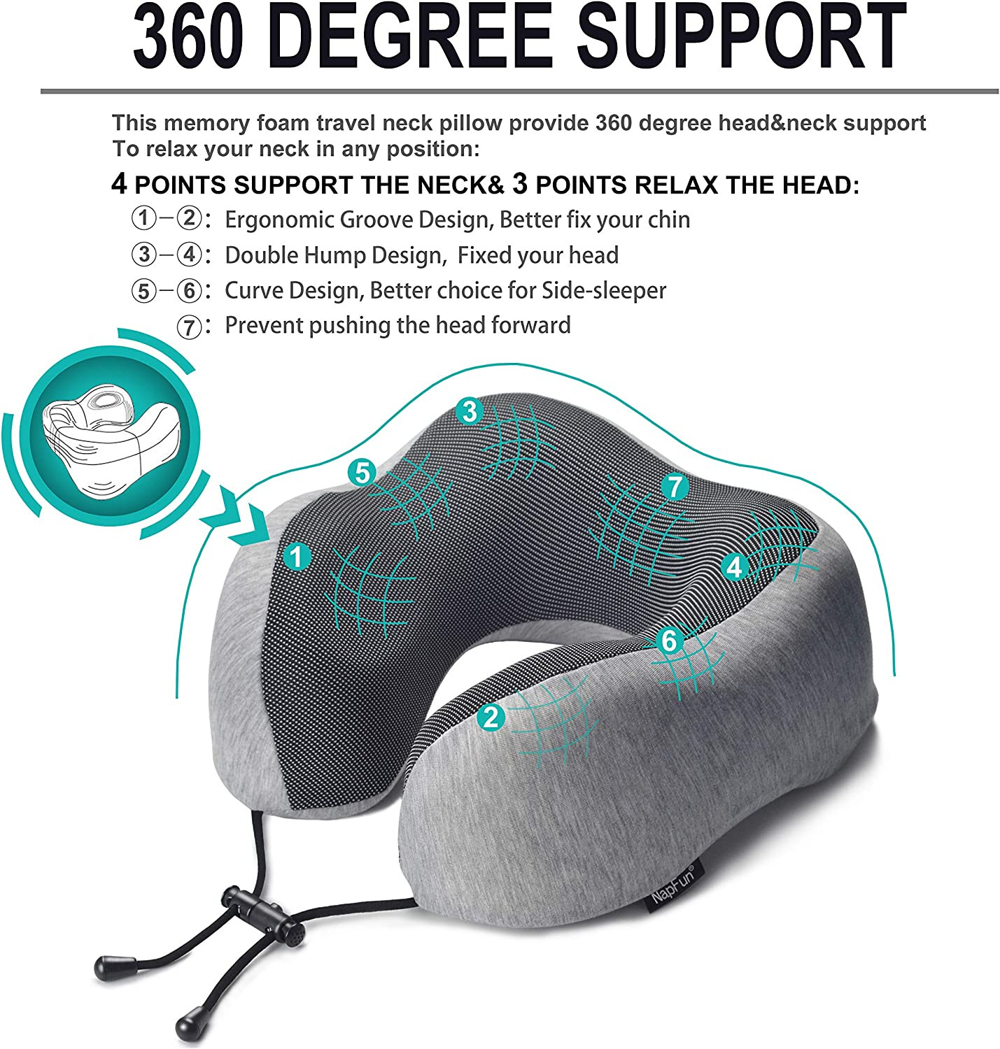 Material Memory Foam Age Range (Description) Adult Recommended Uses For Product Sleeping, Sitting Use for Neck Size 1 Count (Pack of 1) Special Feature Cooling, Portable, Adjustable, Compressible Item Firmness Description Soft Product Care Instructions Machine Wash Number of Pieces 1 PERFECT CHIN SUPPORT TRAVEL NECK PILLOW - This airplane pillow can better wrap your neck and free your chin, prevents the head from falling forward, relieves neck pain during travel.BEST NECK PILLOW FOR TRAVELING - Unlike other travel pillows, This flight pillow can provide perfect support to protect the neck when you are sitting in the airplane, car, train, or bus.PREMIUM MEMORY FOAM - napfun ERGONOMOR travel pillow was made of high quality memory foam with 5 seconds return technology, comfort and durable.REAL PORTABLE PLANE PILLOW - The headrest pillow was designed for portability and comfort. It comes with a portable travel bag that allows the travel pillow to compress down to a smaller size.LIFETIME REPLACEMENT GUARANTEE - If you have any problems, we promise to offer you a prompt and full refund! Product Description The video showcases the product in use.The video guides you through product setup.The video compares multiple products.The video shows the product being unpacked. napfun devote to making perfect travel pillows by taking suggestions from 30,000 buyers. continuously improve product quality & buyer experience. napfun creates the best shopping experience & product usage experience for each buyer, with the best quality products & a professional after-sales team. Series 3 Simple Sets Series 3 Simple Sets comes with: Travel PillowTravel Bag Series 3 Luxury Sets Series 3 Luxury Sets come with Series 3 Simple Sets (Travel Pillow + Travel Bag)Sleep MaskEarplugs Super-soft eye Mask NAPFUN eye mask was made of super soft material, with zero pressure on your eyes Memory Foam Earplugs NAPFUN earplugs contain micron-level air permeation holes inside, providing strong sound absorption. 1 Series 3 Simple Sets 2 Series 3 Luxury Sets 3 Super-soft eye Mask 4 Memory Foam Earplugs Find Your Style What You Get Please open the Black travel bag and check out the items inside. First-use Tutorial Please follow the steps after receiving product How to store After use? Find Your Size Find Your Size by Adjusting the string closure. 1 What You Get 2 First-use Tutorial 3 How to store 4 Find Your Size How should I use the pillow properly after receiving it for the first time? The product is sealed in a travel bag, so it can not be ventilated in transit; consumers who are particularly sensitive to the smell are advised to put the pillow in the vent for 24-72 hours before use. What are the dimension differences between the Small and Medium versions? Our napfun Pillow comes in one small