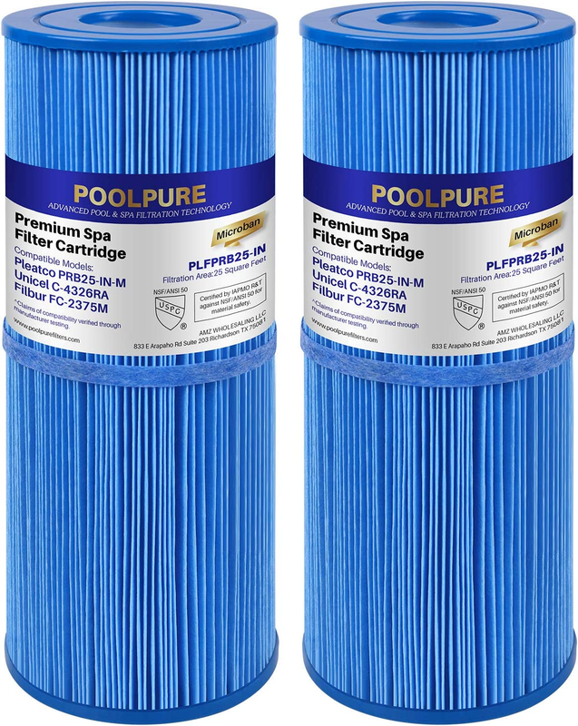 Store New Arrivals Add to Favorite View Feedback Contact Antimicrobia PRB25-IN-M Spa Filter Replaces Unicel C-4326RA, Guardian 413-106, Filbur FC-2375M, 3005845, 17-2327, 100586, 33521, 25392, 817-2500, 5X13 Spa Filter, 2 Pack Description Item Weight 2.81 pounds Item model number PLFPRB25-IN-M Package Dimensions 13.74 x 10.51 x 5.28 inches NSF/ANSI 50 CERTIFIED: Poolpure Pool and Spa filter is tested and certified by IAPMO against NSF/ANSI 50. Poolpure filter delivers better filtering capacity, healthier water, and an awesome swimming experience that you and your loved ones truly deserve.ANTIMICROBIAL FILTRATION FABRIC: This filter Fabric is infused with an blending material, which can inhibit the growth of dangerous and provide continuous, durable and effective added protection for the lifetime of the product ensuring the health, safety and well being of your family.LONGER SERVICE LIFE: The filter cartridges can extend the lifespan of the cartridge and enhance the filtering capacity and quality. It is also easy to wash/clean to recondition the filter. This filter lasts for 1-2 years when proper maintenance is performed.REPLACEMENT MODELS: Length: 13 5/16”; Outside Diameter: 5”; Top Hole: 2 1/8” Open; Bottom Hole: 2 1/8” Open. PLFPRB25-IN-M filter compatible PRB25-IN-M, Unicel C-4326RA, SD-00196, 303909, M-4326, 8172500, R173429, 100586. NOTE: This is a compatible spare part and the manufacturers' names and part numbers have been used for reference purposes only. POOLPURE is an independent brand.EASY CLEANING: The Trilobal Fabric Structure filter material makes it easy to release impurities when cleaning the filter, the filter is like a new one after cleaning. It is recommended that you clean cartridges every 2 weeks to maximize your spa's performance. Product Description Poolpure focuses on bringing great technologies and products to the market that truly provide the cleanest water filtration possible for the health, safety and happiness of every pool and spa owner. How to find a replacement cartridge for your pool or spa? If you already know your filter cartridge's part number or the replacement number, you can use the search the part number on our product page to quickly confirm whether the filter is compatible. If you do not know the replacement part number for your cartridge, then choosing the right cartridge can be accomplished by measuring your existing one. Use the following steps as a guide: 1. Measure the outside diameter of the cartridge in inches (+/- 1/16th inch) 2. Measure cartridge length from end cap to end cap (+/- 1/16th inch). Exclude any handles or extensions. 3. Identify the correct top and bottom type. If the top and/or bottom is open, measure the inside diameter of the opening (+/- 1/16th inch). If the end cap is closed make note of its identifying features. 4. Make note of the manufacturer and model number of the filter into which the replacement cartridge will be installed. 5. Take note whether or not there is a center core (PVC pipe in center). POOLPURE Replacement Filter for Pool and Spa Cleaning Systems Specifications of PLFPRB25-IN: Length: 13 5/16”Outside Diameter: 5”Top Opening: 2 1/8”Bottom Opening: 2 1/8”Filtration Area: 25 sq. ft.Fabric: Antimicrobial Fabric Replacement Part Numbers: Aladdin 12502 | Baleen AK-3011 | Darlly 42513 | Filtros de Excel XLS-403 | Pleatco PPR25-IN-M | Filbur FC-2375M | Magnum RD25 | Harmsco H-4326 | Pure N Clean PC-2375 | SD-00196 | SD-00784 | SD-00150 | SD-00655 | Unicel C-4326RA | OEM 100586 | OEM 33521 | R172327 | 172327 | 17-2327 | R172325 | 2501 | 3005845 | 3301-2242 | 25392 | 817-2500 | 303909 | M-4326 | R173429 | 17-34 29 | Rainbow / Pentair Dynamic 25 | TOREAD TRF-4326 | 100586 | PLE-051-9395 | 645544023759 | 090164010007 | FC-2375-HB | 4900-61 | 4902-110 | 4904-003 | P-4326 | P-4625 | 413-106 | C-4625 | PRDC25 | RDC-25 5 | RR DC-25S | PDC25-AFS | 17-175-1606 | 17-175-1210 | 27-101 | 162387 | 17-175-1592 | 17-175-1210 | FIL1111111010 022 | RTO-25 | 2505RS | RTL25 | RCF-25 | 04-13030 | MF-170 | 17-B1086 | PRB 25IN3 | PBH25-IN This filter used in pools / spas made by: Nordic Hot Tub | Dr Wellness Spa | Royal Spa | Beachcomber Spa Note: All manufacturers' names and part numbers remain the property of their respective holder(s) and are used for compatibility information only. Top Quality Antimicrobial