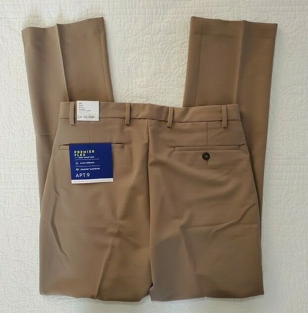 NEW Men's Apt. 9 Premier Flex Dress Pants from Kohls. New with Tag. Color is Tan (Brown). 75% Polyester, 20% Rayon, 5% Spandex. HEIQ Smart Temp, 4-way Stretch, Comfort Waistband. Slim Fit - Sits Below Waist, Slim Through Hip and Thigh, Slim Leg Opening. Available in Size 29x30. Please see Photos. Thanks for Looking!S3-1