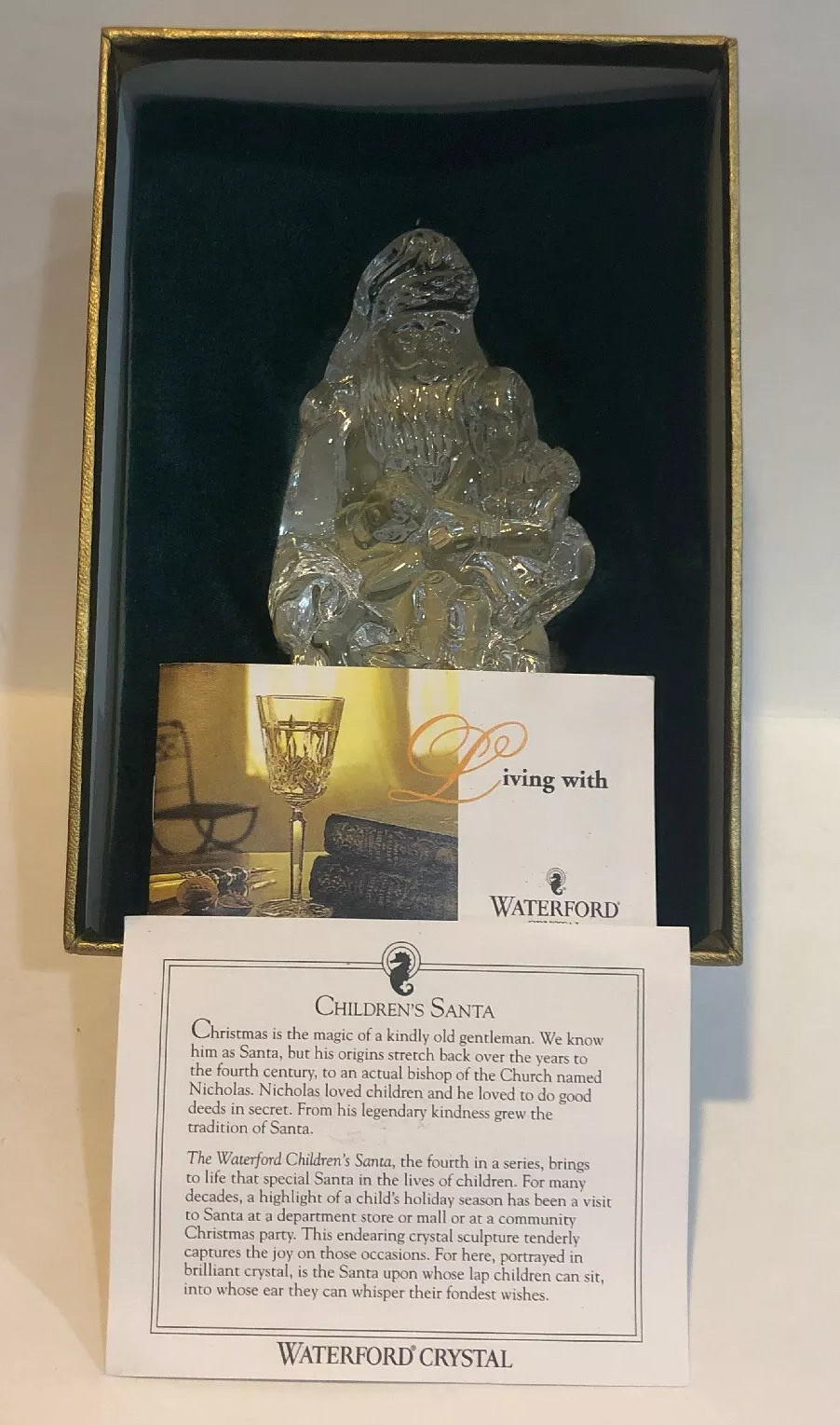 WATERFORD CRYSTAL-FOURTH EDITION- Santa Claus with Chid Sculpture. The sculpture is in excellent condition comes with original box and paperwork. The padding does have some wear on it and the sculpture stand 5.75" tells by 3" wide. Please see pictures for more details. Thanks for looking. -PET AND SMOKE FREE HOME. (S5)
