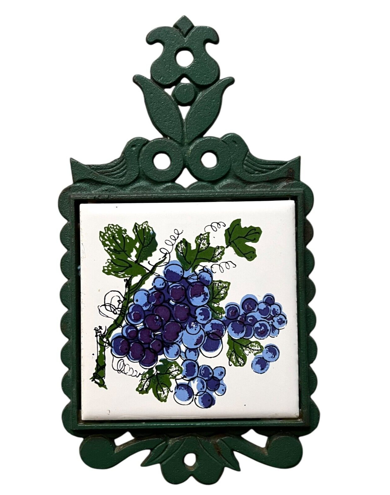Vintage Cast Iron Ceramic Tile Trivet Hand Painted Grape Design Decor 9.5 in H