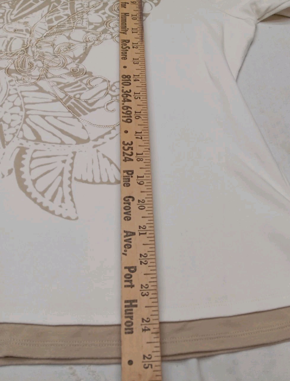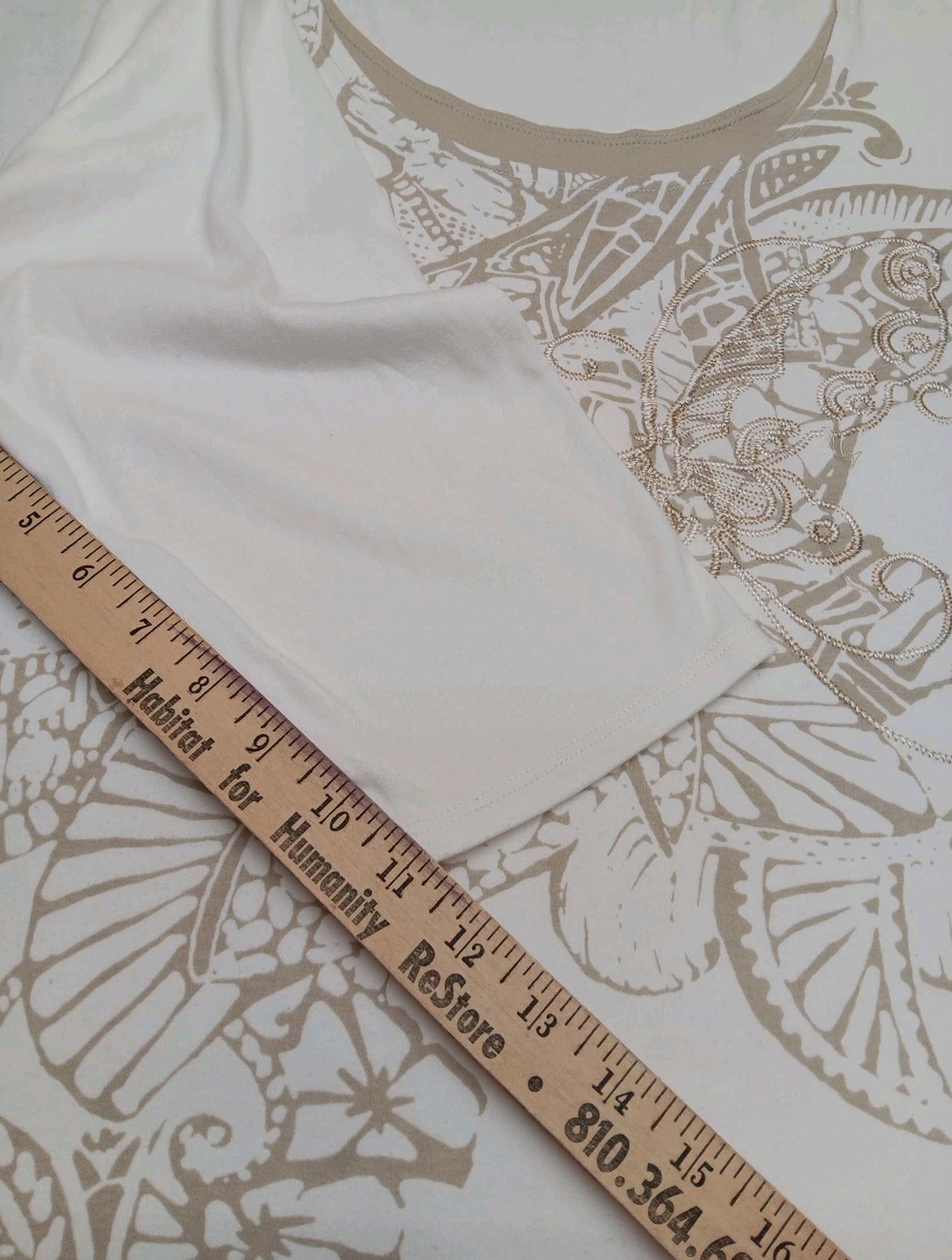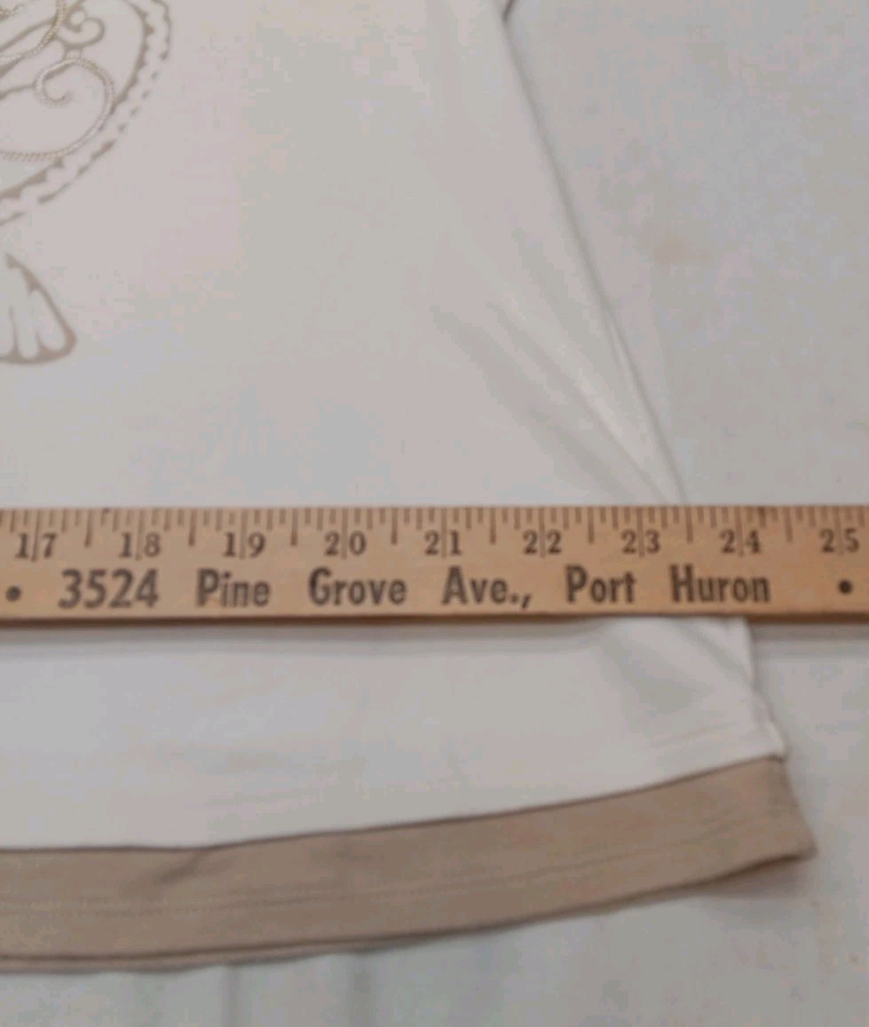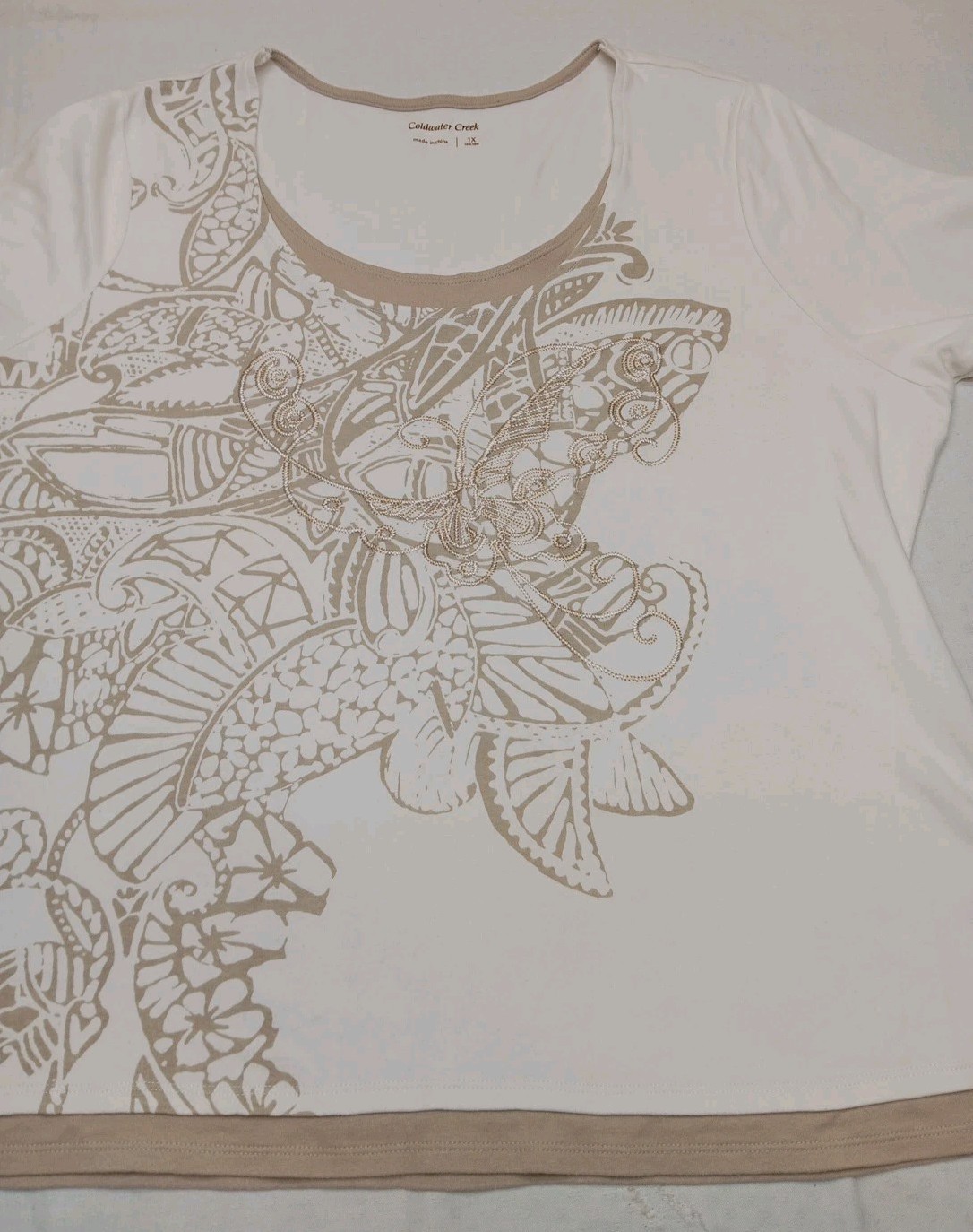 size 1X features a beautiful floral embroidered design with 3/4 sleeves, making it a stylish and comfortable option for casual occasions. The cream tan