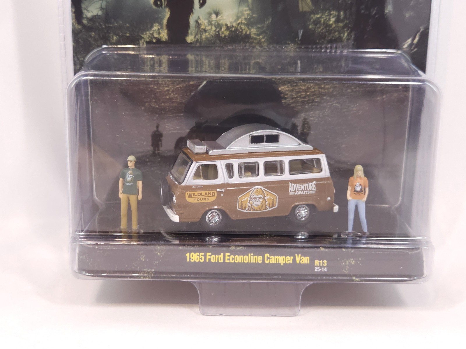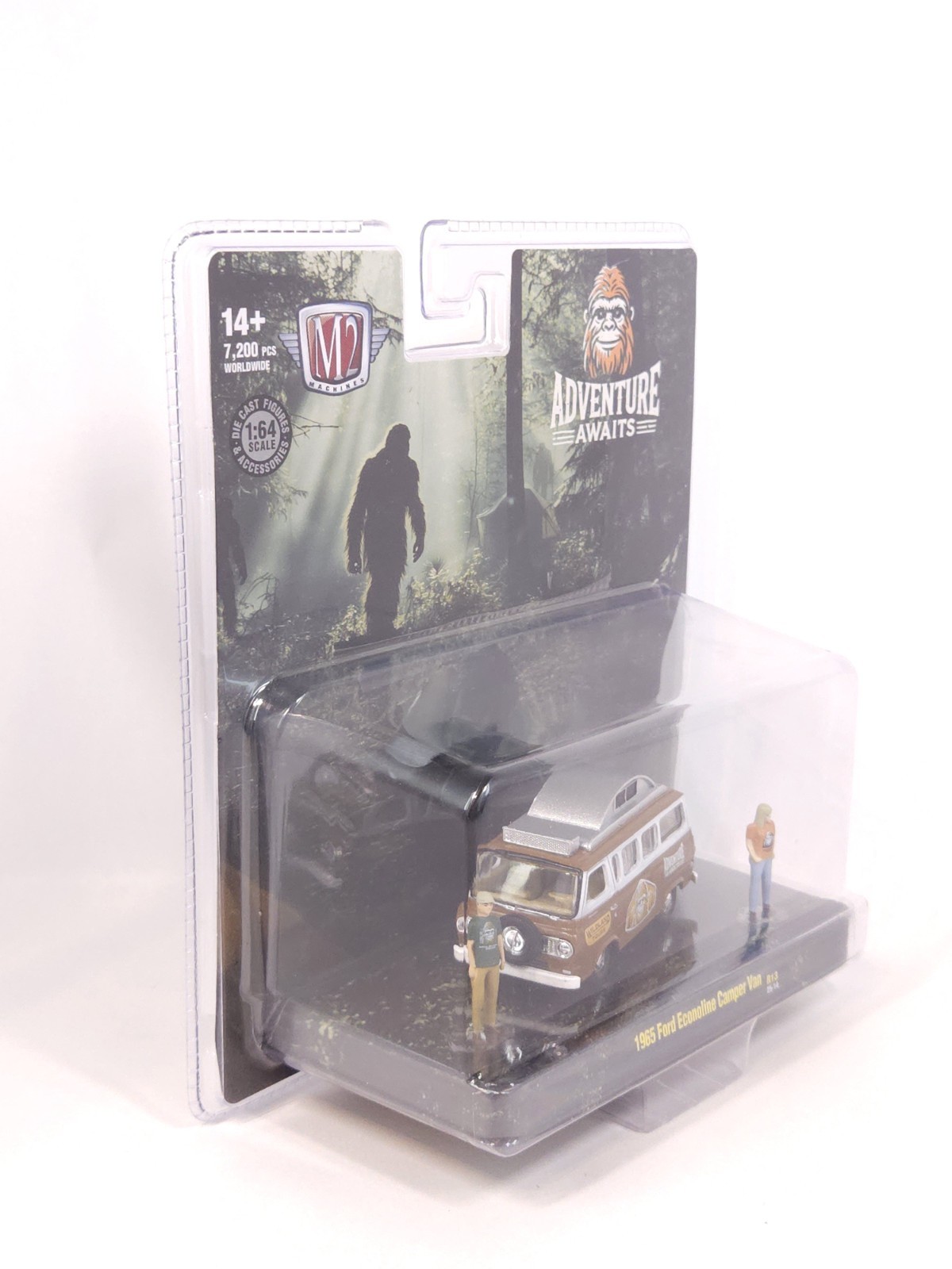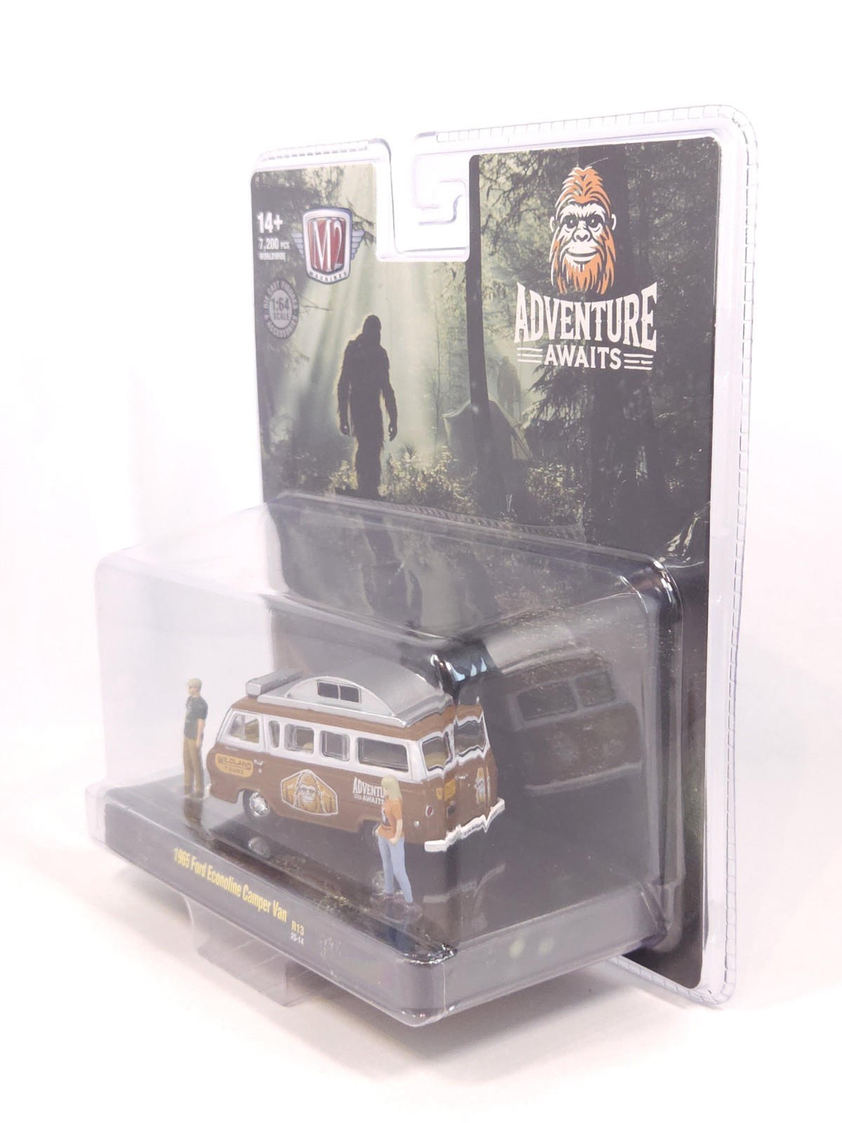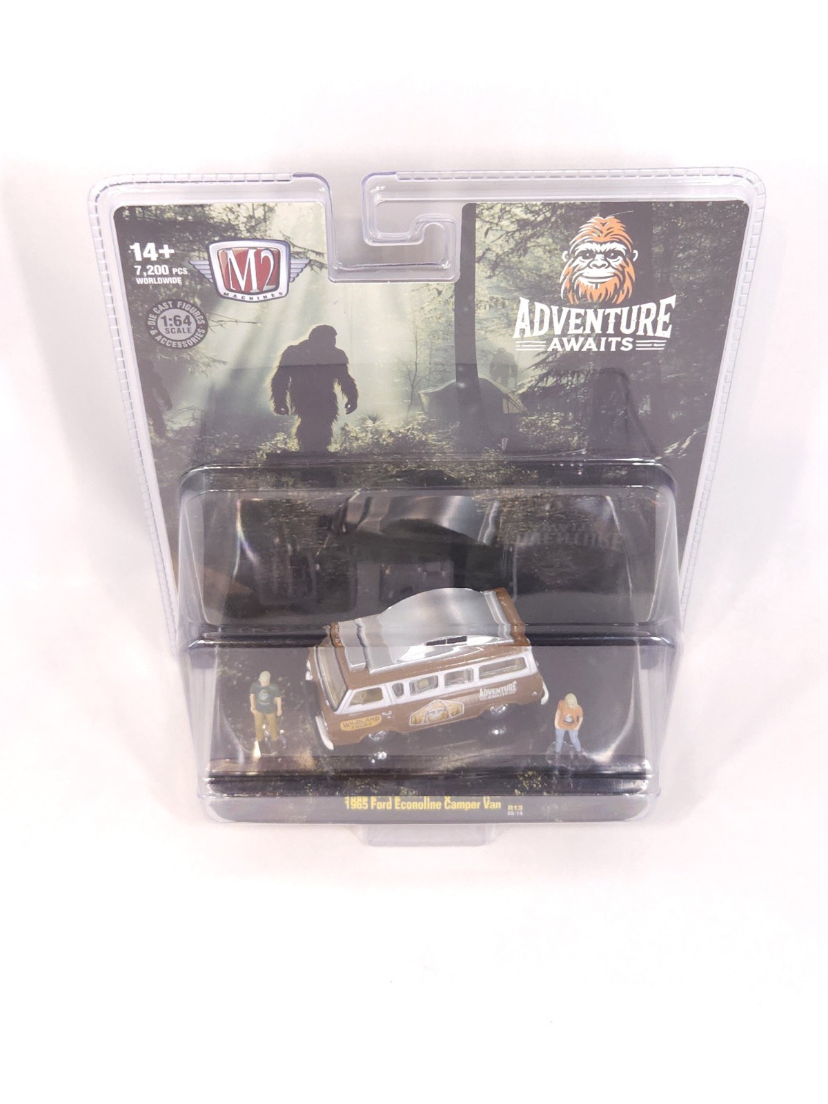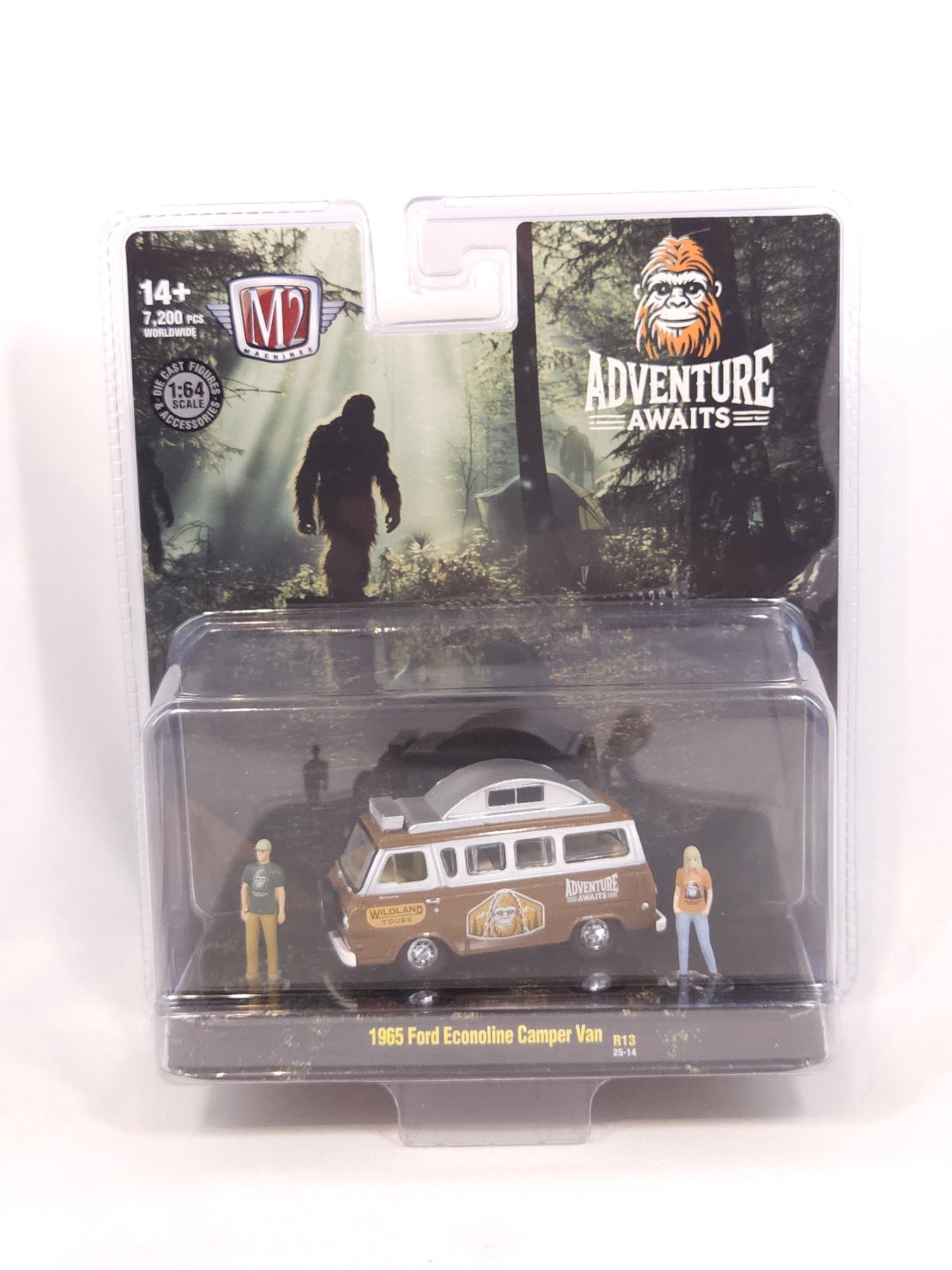 | Features | Limited Edition, Special Edition, Unopened Box, M2 Machines “Adventure Awaits” 1965 Ford Econoline Camper Van, the Adventure Awaits logo and Sasquatch motif, Brand: M2 Machines, Series: Adventure Awaits Collection, Model: 1965 Ford Econoline Camper Van, Scale: 1:64, Item Number: R13 (25-14), Edition: Limited to 7,200 pieces worldwide, Features: Includes 2 die-cast figures and camping accessories, Two-tone brown & white with “Adventure Awaits”, “Wildland Tours” graphics, Factory-sealed blister card with scenic forest background art, Recommended Age: 14+, Material: Die-cast metal body and chassis with plastic details, The item is brand new and factory-sealed in its original packagin |
