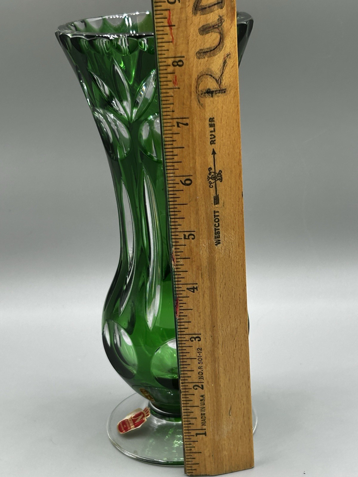 This antique lead crystal flower vase features a diamond-cut pattern with emerald green and clear glass. Measuring 8.5 inches tall, it’s a classic decorative piece for displaying fresh flowers or adding vintage style to a shelf or table. Condition is used; check the listing for details on any signs of wear, chips, or repairs. Free shipping is included, and the item will be packed for safe delivery. Check the listing for details.