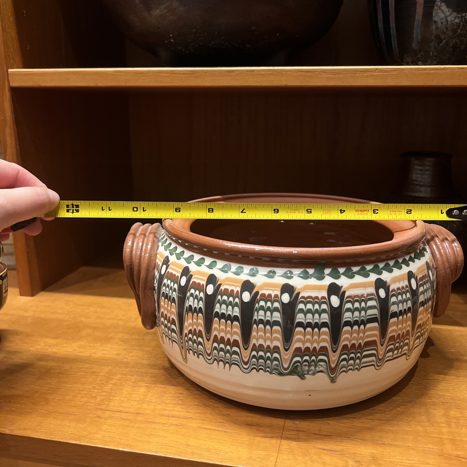 Large Vintage Bulgarian Covered Pot/Tureen Troyan Redware Pottery, Pulled Glazed