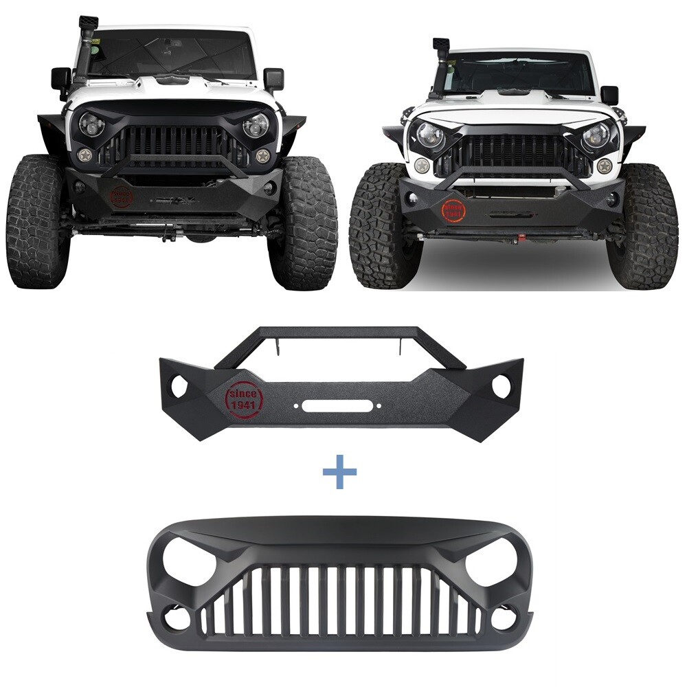 Replaced Black Steel Front Bumper + ABS Grille for Jeep Wrangler JK 2007-2018Feature: Front BumperMid Front BumperAccommodates Fog Light Housings and A Lamp with the LOGO "Since 1941"Built-in Winch Plate for up to 12000 lbsAggressive ProtectionWeight: 69 lbsFits 2007-2018 Jeep Wrangler JK ModelsTwo Stage Textured Black Powder Coat FinishBolt-On InstallationHeavy Duty High Strengh Steel ConstructionPerfect for Off-Roading ProtectionFront GrilleReplacement GrilleMatte Black100%