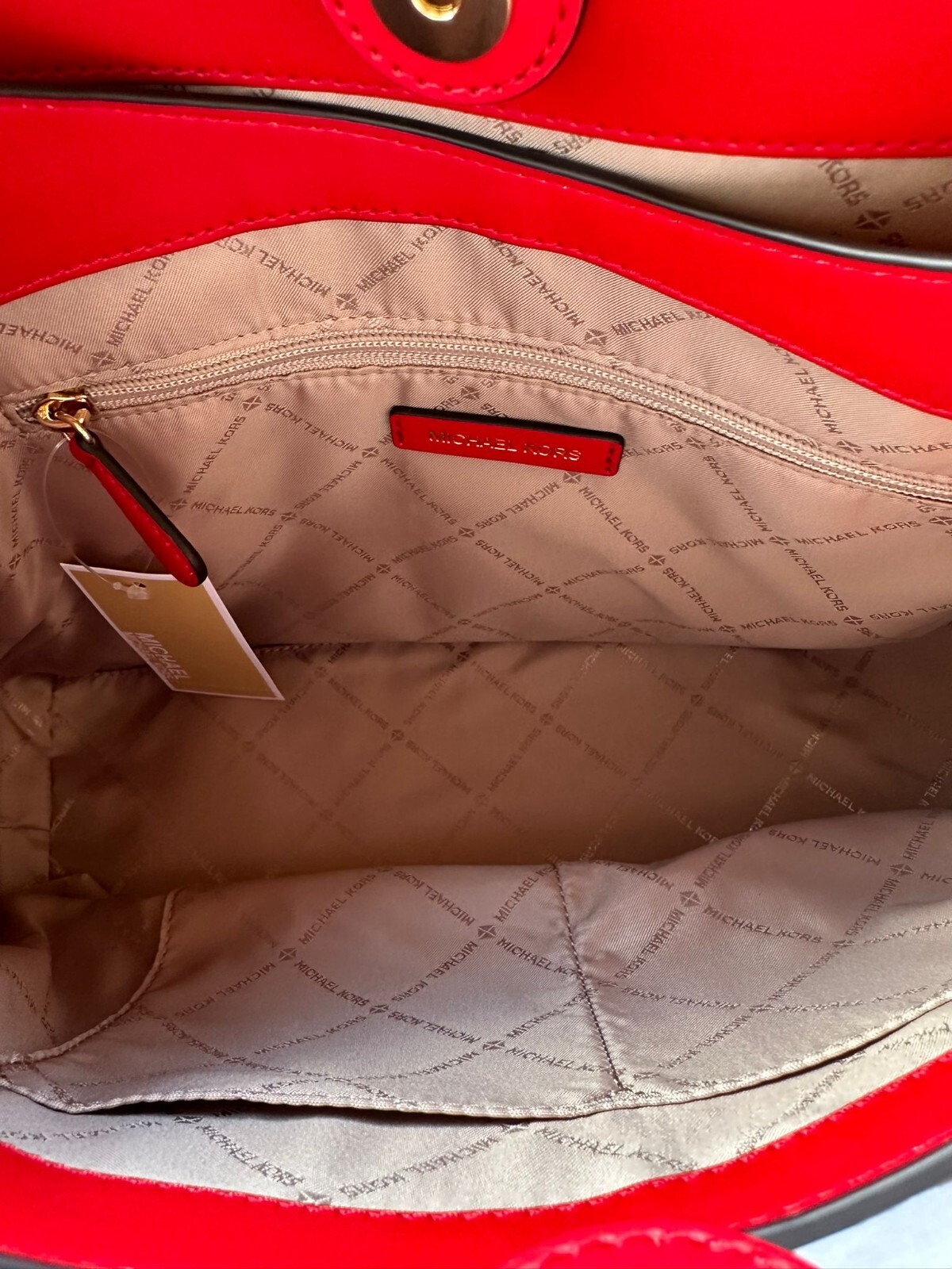 MICHAEL KORS TRISHA LARGE LEATHER TRIPLE GUSSET SHOULDERTOTE BAG - BRIGHT REDABOUT THE ITEMTRISHA SHOULDER BAG DETAILSPlease look at approximate dimension below before purchasing. APPROX. DIMENSIONS: Top: 12 inchesLength (L): 14 inchesHeight (H): 10 inchesDepth (D): 6 inchesColor: Bright RedSize: Large (L)100% Authentic or Money Back Guarantee~~~ALWAYS!!!FEATURES:Gold Toned HardwareLeather MaterialMichael Kors Logo At FrontTop Snap Closure Custom Fabric Lining3 Compartment with Magnetic Snap Closure1 Slip-in Pockets1 Zipped Pocket Powered by ExportYourStore.com