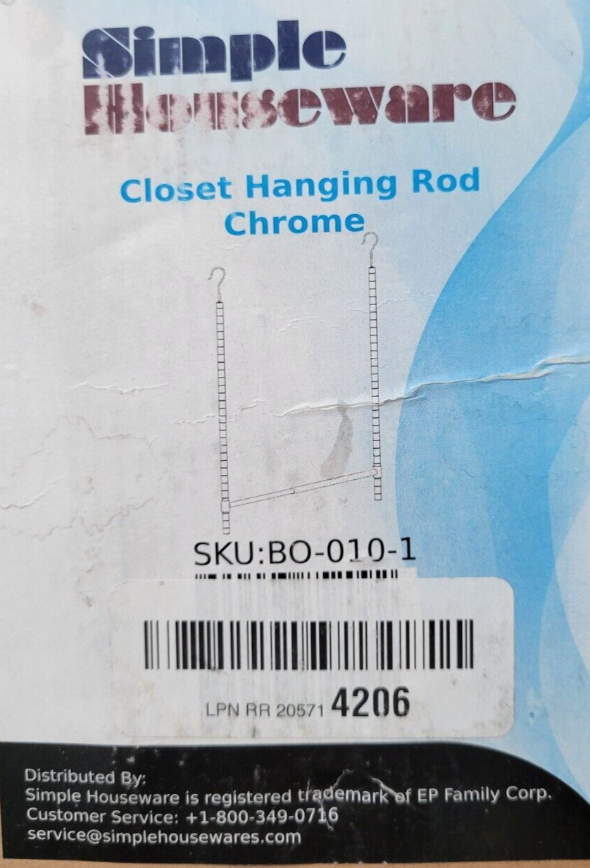 SIMPLE HOUSEWARE SILVER CHROME CLOSET HANGING RODS 31 INCHESOpen box. Fantastic buy!!!SIMPLE HOUSEWARE Silver Chrome Closet Hanging Rods4 Rods: 15 1/2"2 Solid Rods: 16 1/2"2 Hooks: 4 1/2"4 Half Plasti Grips: 1 1/4"FREE SHIPPING!!!