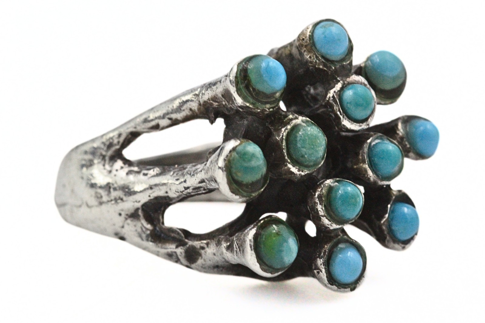 Welcome to Le Belle Jewels Co! DESCRIPTION: This modernist brutalist ring is crafted from solid sterling silver, showcasing a bold and sculptural design. At its center, a striking cluster of snake eye turquoise stones adds vivid