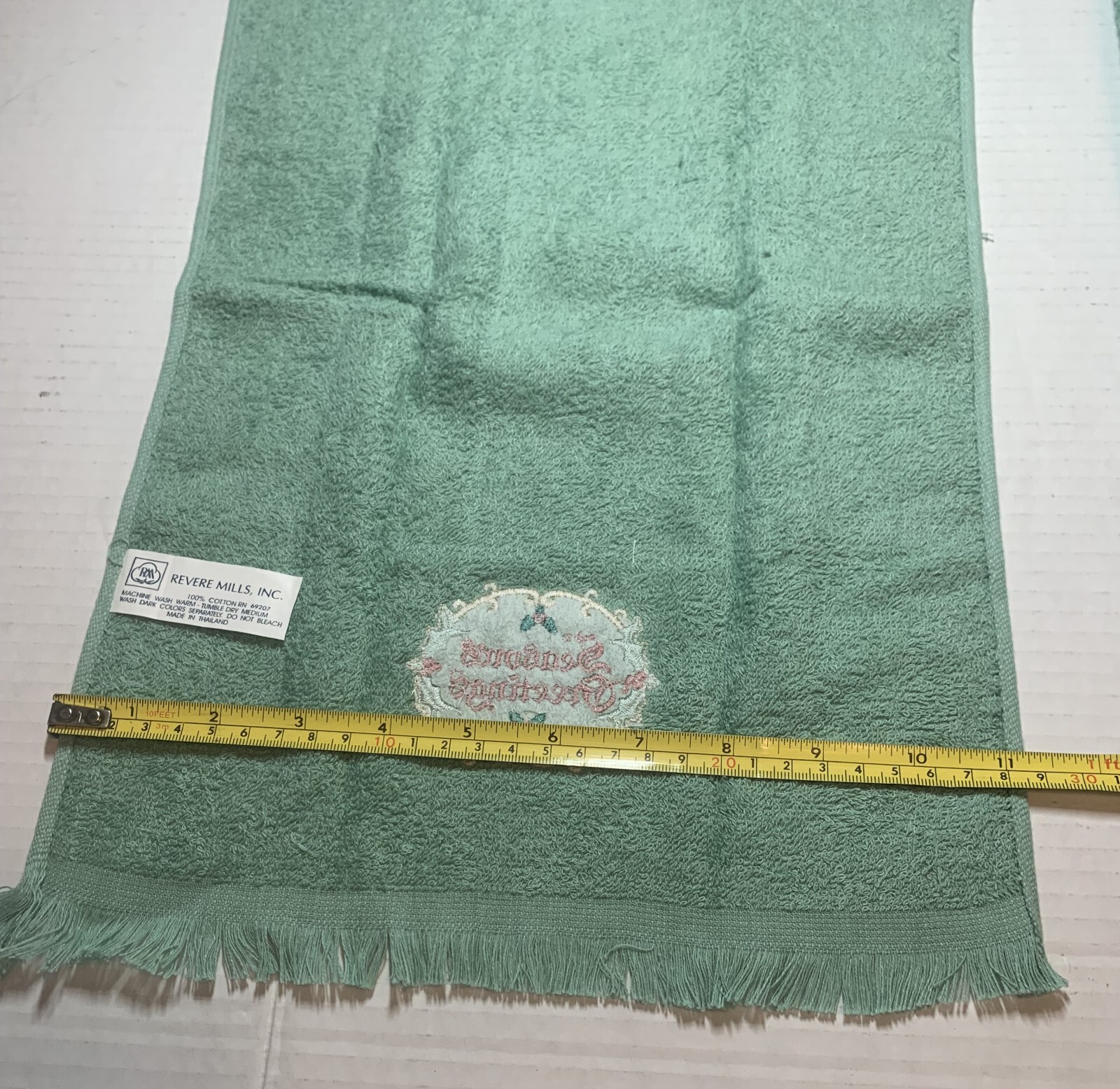 color green and have the same colors on the embroidered pieces and could easily be mixed or matched for use. The bath towels are approximately 22" x 42"; the guest are approximately 11.25" x 18". Enlarge and look at all photos for more details on condition, design and size. Please contact if additional information or photos are needed.