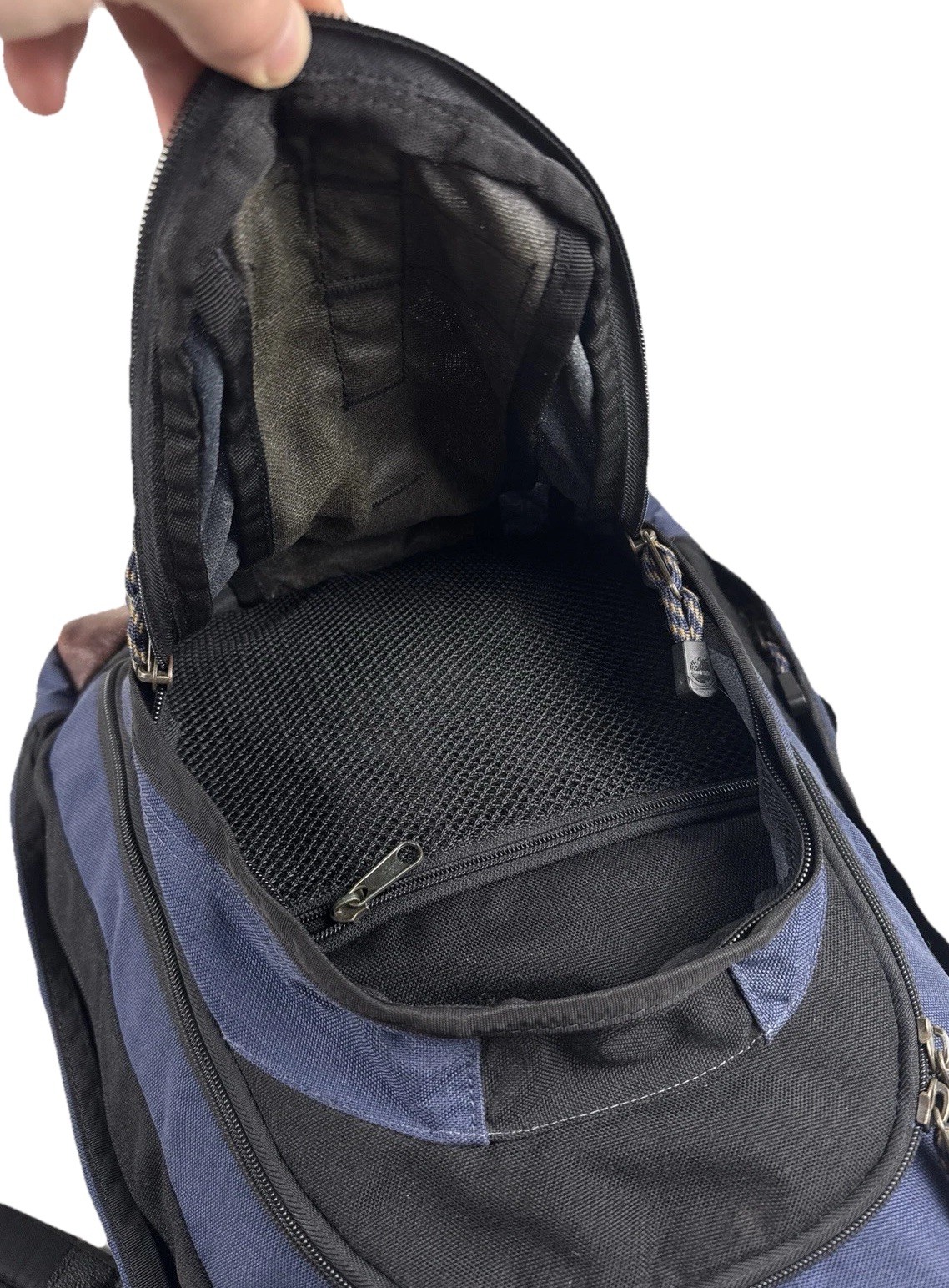 Vintage Timberland Backpack Canvas Daypack Blue Black Leather Bottom 90s Specs