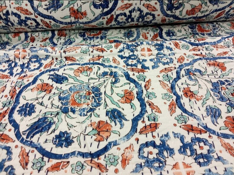 Indian King Size Hand Block Cotton Kantha Print Blanket Handmade Quilt Bedspread