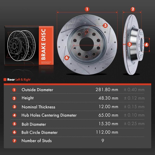 Material Cast Iron Outside Diameter (MM) 281.8 Height (MM) 48.3 Nominal Thickness (MM) 12 Hub Holes Centering Diameter (MM) 65 Mounting Bolt Hole Quantity 9 Bolt Circle Diameter (MM) 112 Bolt Diameter (MM) 15.3 Discard Min. Thickness (MM) 10 Solid Or Vented Type Rotor Solid Package Quantity 1 Packaging Type Box Fitment Direct Replacement PAYMENT We accept Paypal only for the payment, and all orders should be paid through Ebay auction, please do not pay directly to our Paypal account. Paypal allows to pay by Credit Card, Direct Debit, VISA, eCheck, or other methods, please kindly check Paypal for more information. For multiple purchases, please add items to your Ebay shopping cart and pay once for entire order. SHIPPING Attention to customers from California: WARNING: Cancer and Reproductive Harm - www.P65Warnings.ca.gov. All orders will be shipped out within 1 business day after payment is cleared. Most of orders will be shipped out at the same day if ordered before 8:00 AM PST(Pacific Standard Time) during business days. All orders will be shipped out via USPS or UPS or Fedex express with a tracking number, which will take 2-6 business days for the delivery. The freight cost listed in the auction will be for domestic 48 states only. For customers from Guam, Puerto Rico, Northern Mariana Islands, Virgin Islands, Marshall Islands, Alaska or Hawaii, please kindly message us for an accurate quotation. We do not ship to P.O. Boxes, APO/FPO or Military Mail Box. We only ship to Paypal confirmed address, please make sure that the address is correct before you check out. Terms of Sale30 Days Free Return and Money Back If you are not satisfied with your purchase, you can return the item with original packaging back to us for full refund, not any re-stock fee. The return cost should be paid by seller. Kindly contact us for return instruction before returning. One Year Unlimited Mileage Quality Guarantee If you receive any wrong items, or damage during the transportation or defect items, we will accept the return and pay the return freight. Please noted that the return cost should be prepaid by buyer, we will issue the refund of return cost to buyer after inspecting the faulty item. The full refund or replacement will be available for all faulty items, including the original shipping cost. Please kindly contact us before return, our representatives will send you the detailed return instruction. The guarantee will be only for the cost of the item, we will not responsible for installation or other fees like labor expenses, towing expenses, additional repair expenses or other related expenses. ABOUT US Autoparts_Premium only sells high quality products, all items in our store will come with one year unlimited mileage quality guarantee. All items are brand new and packed by box. The additional packing material will help you reduce the damage risk a lot during the transportation. We fully understand how challenging it is to be a successful transaction. If you are not 100% satisfied with your purchase, please do not hesitate to tell us, our sales representatives will try the best to make you happy. Customer satisfaction is our priority consideration!