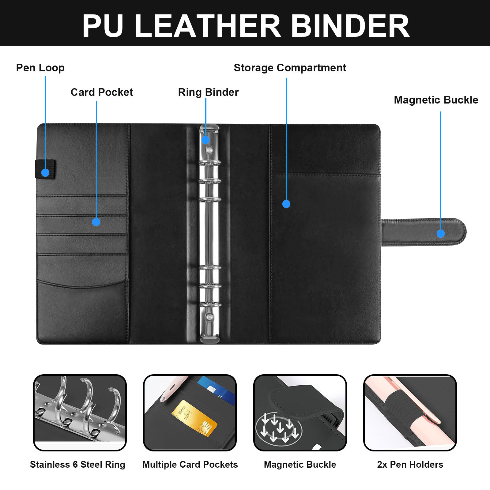 size of the cash binder allows you to take it with you wherever on your daily commute, to work, or even on vacation.【ENVELOPES WITH ENLARGED PRINTED 1-100 IDENTIFIERS】Unlike other envelopes pages without numerical numbers or require manual pasting of stickers, our envelopes pages feature clearly printed and enlarged numerical numbers, making them more convenient to use. You can find the envelope you need at a glance.【ESSENTIAL TRACKER CARDS FOR THE ENVELOPES SAVING CHALLENGE】To enhance your tracking experience, this set contains two tracking cards. These cards help you monitor your savings progress and motivate you to achieve your goals on time. When you save a certain amount, just mark the corresponding number icon. Once all icons are marked, the savings challenge is completed successfully. This method makes tracking your savings progress effortless.【A PRACTICAL AND EDUCATIONAL GIFT】The 100 envelopes money saving challenge binder kit is a practical and educational tool that encourages family involvement in saving money. By engaging in savings challenges, individuals can have fun while taking charge of their finances. It is a thoughtful and practical gift for friends and family to easily save spare change and start working towards their financial goals.Specification: Color: BlackMaterial: Durable PU Fabric, Faux LeatherDimensions: A5 Size BinderClosure Type: SnapSpecial Feature: Waterproof (Not Paper)Package included: 1 PC A5