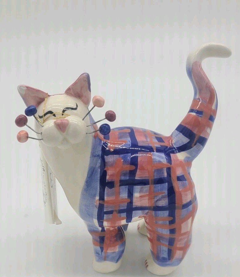Handpainted 2001 Annaco Creations Standing Cat Figurine In Pink & Blue Plaid Specs