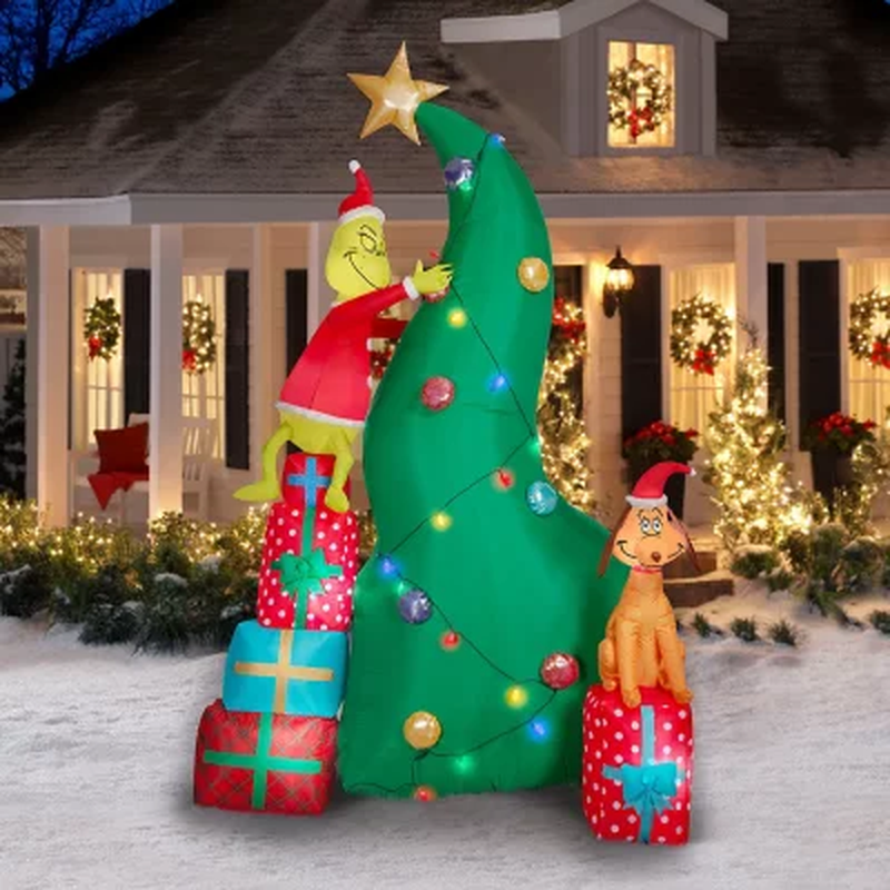 10' Dr. Seuss Grinch and Max Christmas Tree Pre-Lit Airblown Inflatable Bring the holiday spirit to your home with the Grinch, Cindy, and Max Airblown® Inflatable Christmas Tree. This captivating inflatable decoration is sure to delight guests and passersby alike, adding a touch of charm to your festive decor. Setting up this inflatable Christmas tree is a breeze. Simply plug it in, stake it down, and watch as the magic unfolds. Perfect for outdoor display as a standalone decoration or paired with other Airblown® Inflatables to create a custom scene. Equipped with bright, energy-efficient LEDs Effortless self-inflation in a matter of seconds Convenient deflation for easy storage Includes heavy-duty lawn stakes, tethers and everything else youll need Size: 75W x 49D x 120H Lead Cord Length: 5 lead cord for easy connectivity Not only is this inflatable tree ideal for outdoor use, but it also makes a perfect indoor decoration for parties and celebrations. Its a versatile piece that can add a festive touch to any setting. The package includes everything you need for an easy setup. No additional tools or materials are required, making the process hassle-free and convenient for you. Occassion Christmas Character The Grinch & Max Color Multi