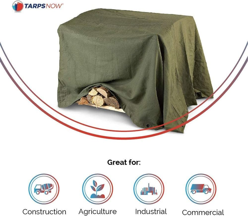 Tarps Now Canvas Tarps with Brass Grommets, (5' X 7') - Heavy Duty Sheet Cover ULTIMATE PROTECTION: Our heavy duty canvas tarp is your go to choice for reliable camping protection. It is water resistant and ideal for outdoor adventures. These tarps are crafted from heavy duty 100 precent Single Fill Cotton Canvas which are water protective and won't be torn easily. These Agrade tarps ensure optimal performance in all weather conditions.STURDY AND RELIABLE: This heavy duty tarp is a large Tarp Crafted with brass grommets, our canvas tarp ensures a secure tie-down and structural integrity, even in challenging weather conditions. Our high-quality industrial grade heavy tarp are treated with waxed paraffin; they can last long through complicated building job.VERSATILE APPLICATIONS: Perfect for camping, construction, and more. Use it as a tarpaulin sheet cover, ground tarp, or a cover for your tent camping tarp needs.SPACIOUS COVERAGE: With a large tarpaulin size, our tarp cover provides ample space to keep your gear dry and protected in the great outdoors. This Olive canvas tarp measures 5' x 7' where the base fabric is 10 oz per sq yd, the finished fabric is 16 oz per sq yd and the thickness is 18mil. These tarps are cut