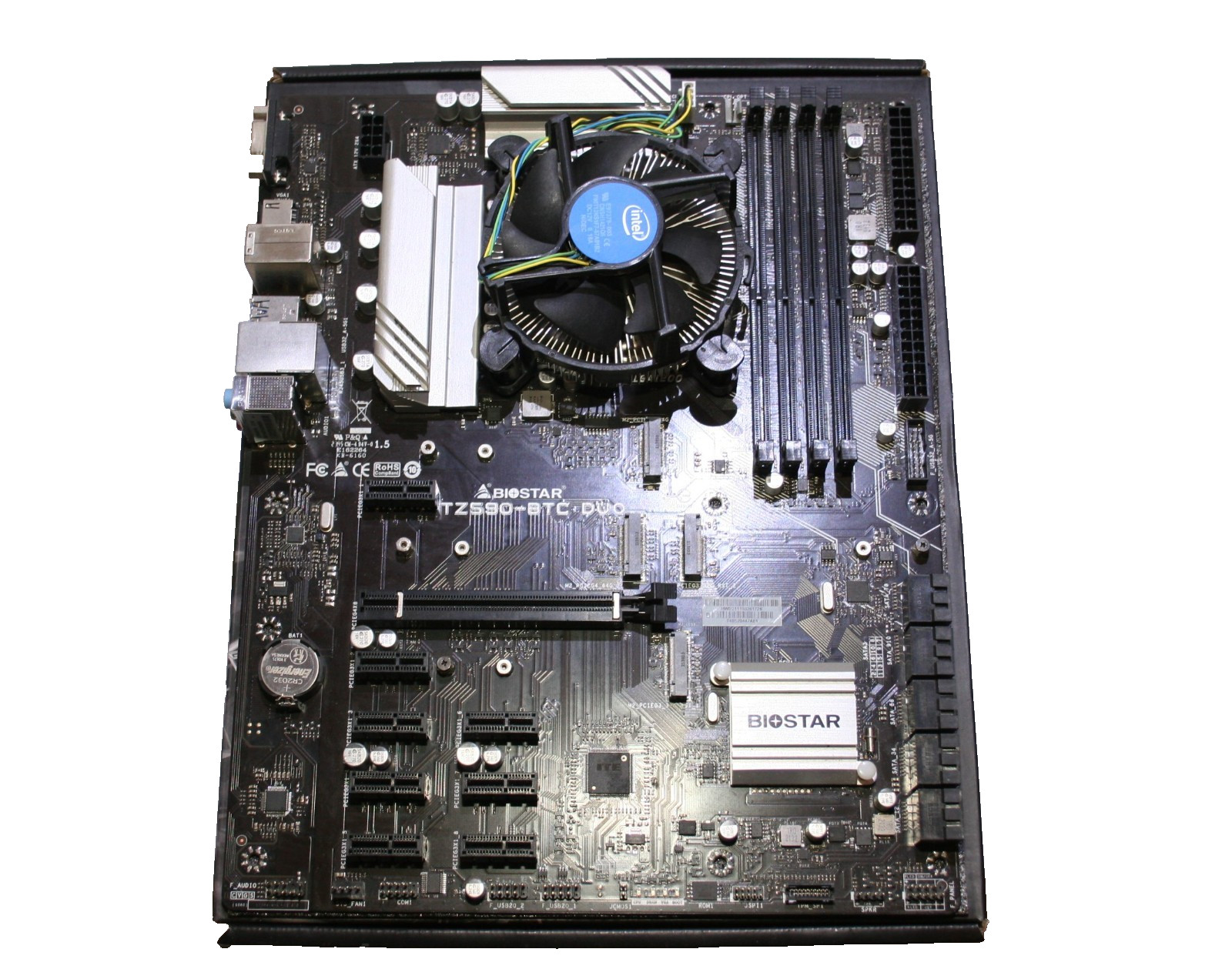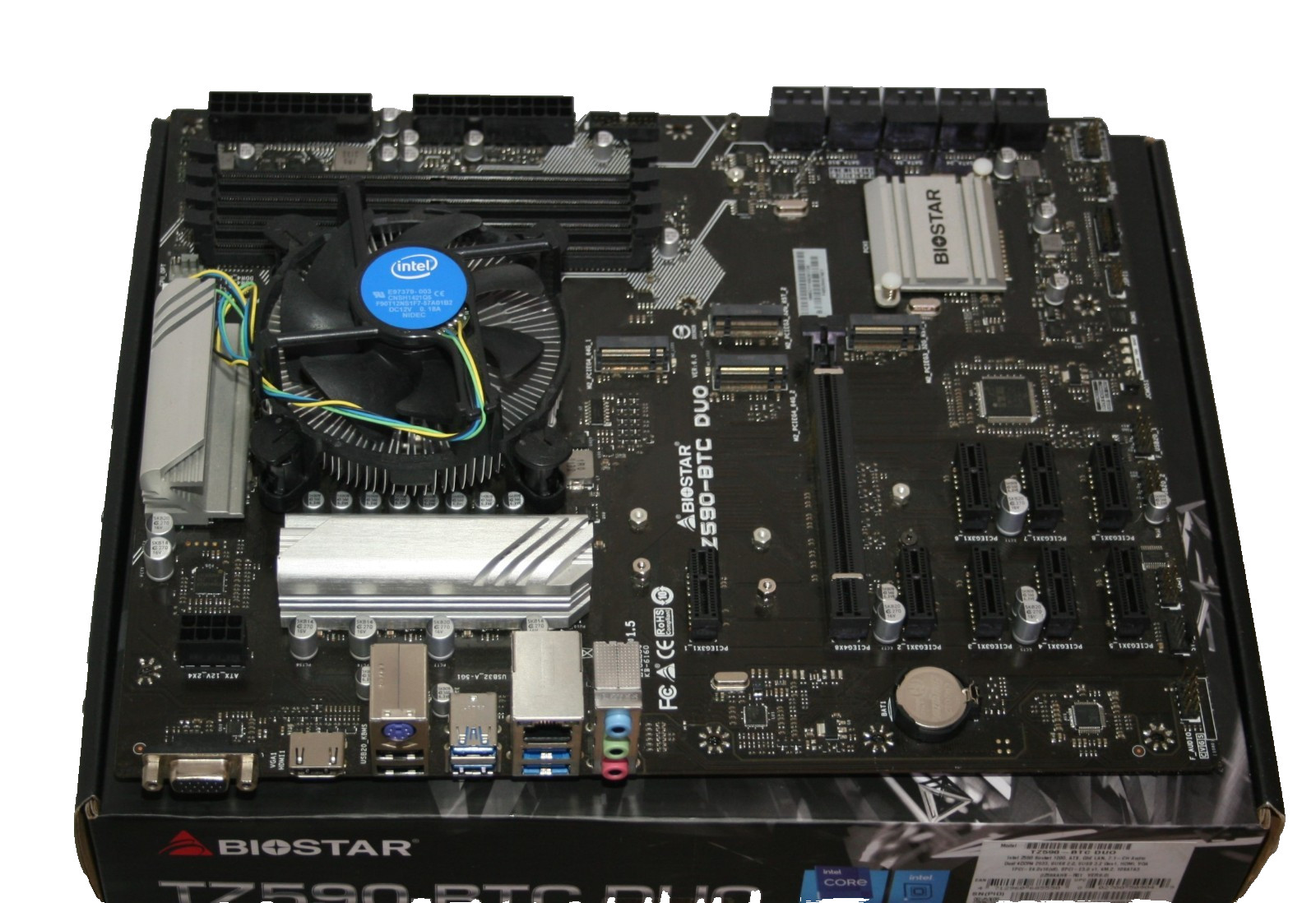 Just about everything you need to build a little GPU mining rig!Biostar TZ590-BTC DUO Motherboard + Intel Celeron G5925 CPU Combo | 9 GPU Support includes 8GB Crucial Ballistix RGB, 6 risers with cable