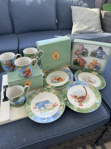 Set of 4 dessert plates, mugs and napkin rings with the simply Pooh design. Disney collectible