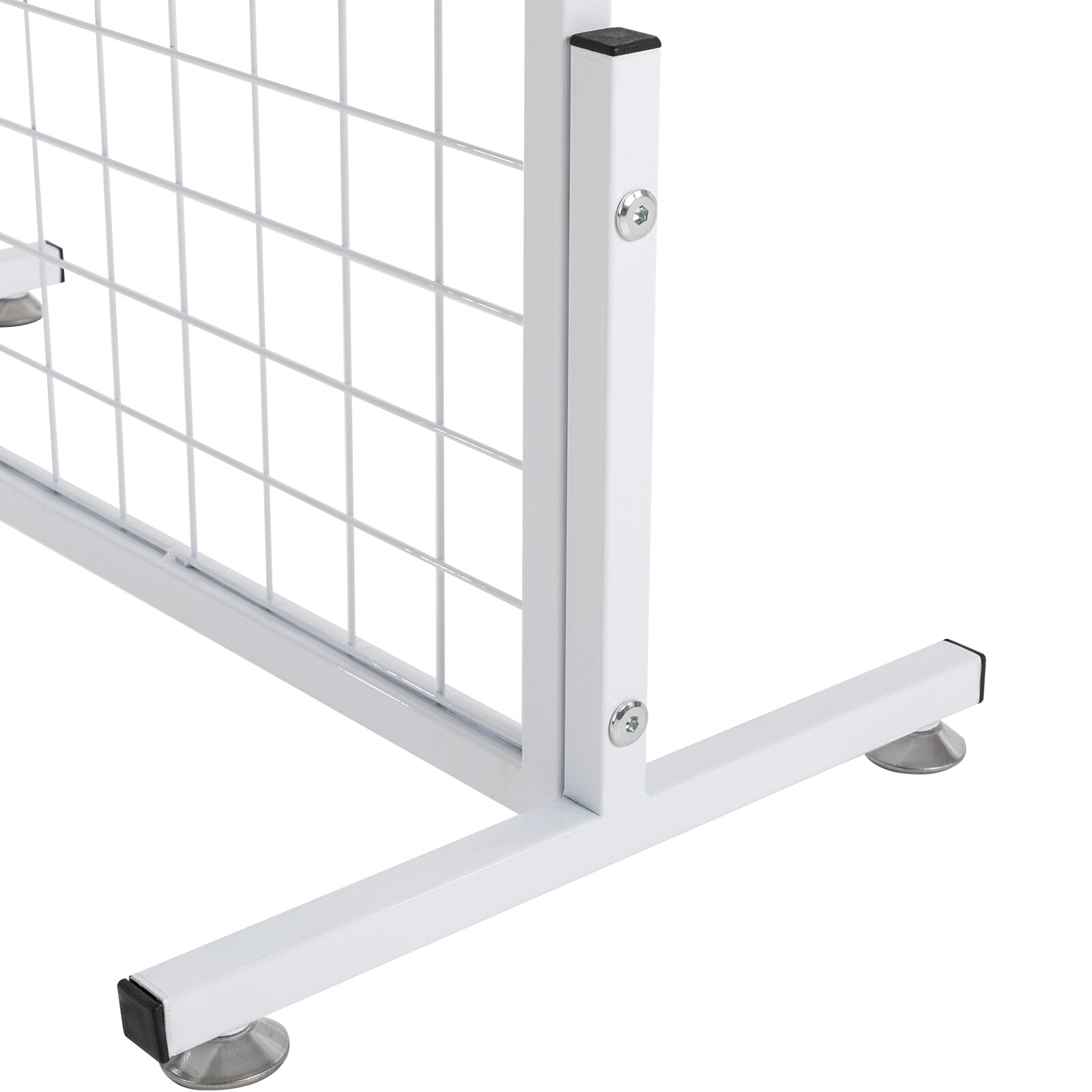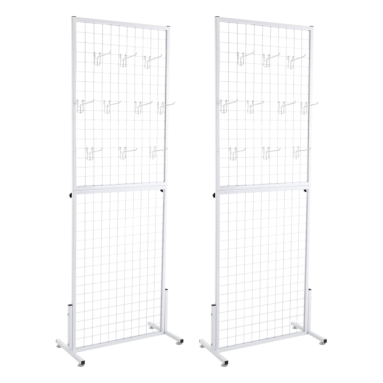 size can hold various snacks or items, which gives it great storage capacity to meet your storage and display needs. Freely DIY: The multi-grid design of this product allows you to DIY freely, hanging small dolls, photos, snacks, or some jewelry on it. Your creativity can turn it into a beautiful landscape. Easy to Assemble and Store: The grid wall panel is decomposed into 2 pieces, and you simply connect them and install the bases with the equipped screws and Allen key, which is simple. You can also disassemble it for convenient storage when not in use. Minimalist Style: This product has a strong sense of white lines, which is a postmodern feature used as decoration and will give you a relaxed and casual feeling. Ideal Gift: This product has high fashion and practicality, making it ideal as an opening gift for retail owners or a housewarming gift for your friends. Professional After-sales: We stand behind all our guests and look forward to assisting you with your purchase. It is our pleasure to answer your confusion and questions. The end of the story between us is not "we sell and you buy". DetailsAnti-slip Foot Pads: They can be slightly adjusted to adapt to uneven floors and can protect the ground from scratches without accidental slipping. Complimentary Hooks: This product comes with 10 hooks as a gift, allowing you to hang your items after receiving the product, which is very thoughtful. Smooth Edges: Smooth edges can protect your skin and increase the safety of product use. ApplicationThis product can be used for art exhibitions, supplier events, shirt displays, and craft displays, as well as home, kitchens, garden retail stores, outdoor and office to hang art paintings, miscellaneous items, clothing, necklaces, photos, snacks, headbands, hats, keychains, earrings, etc. SpecificationMaterial: IronColor: WhiteStyle: ModernShape: RectangleNumber of Items: 2Number of Hooks: 20Assembly Required: YesRoom Type: Indoor, Outdoor Age Range (Description): Adult Surface Treatment: Electrostatic Spraying Product Care Instructions: Wipe with a Dry Cloth Gross Weight: 13kg/28.66lbNet Weight: 12kg/26.45lbGrid Width: 4.83cm/1.9 in Each Hook Length: 10cm/4inReinforced Bracket Height: 22.86cm/9inProduct Size: 94*40*185cm/37.01*15.75*72.83in Package Size: 100*64*14cm/39.37*25.2*5.51in Package Included2*Grid Display Racks20*Hooks2*Allen Keys2*English Installation Diagrams All Accessories Required for Installation NotesSmall parts included, please keep away from children in case of choking risk.Please keep two sides of the panel evenly stressed to avoid affecting the service life.Please strictly install this product under the guidance of the installation diagram. Please allow the slight