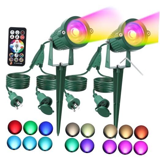 color changing spotlights; Ideal for any occasion, these lights offer a spectrum of colors and modes, easily controlled via the included RF remote; Adjust colors, brightness, and modes without line of sight limitations, and schedule automatic on/off with the timer button for hassle free, energy efficient lighting; Enjoy enhanced range and reliability for the ultimate convenience and customizationIP66 Waterproof Durability: Made of quality plastic and metal and designed to withstand the harshest weather conditions, our landscape lighting is IP66 waterproof rated, ensuring reliable performance in rain, snow, and dust; This exceptional durability keeps that your outdoor lighting remains bright and effective, no matter the elements, providing you with long lasting illumination year roundFestive Outdoor Lighting: Ideal for holiday decorations and celebrations, our Halloween/Christmas spotlights bring vibrant, dynamic lighting to your festivities; Easily switch between a spectrum of colors and modes to create a magical atmosp for any event; Make every occasion unforgettable with stunning, customizable illumination. Ideal for gardens, patios, driveways, and outdoor events, these spotlights offer endless possibilities to brighten and beautify your outdoor spaces PLEASE MESSAGE US IF YOU HAVE ANY OTHER QUESTIONS, AND MANY THANKS FOR READING ALL OF THIS. Copyright ©#. All Rights Reserved.