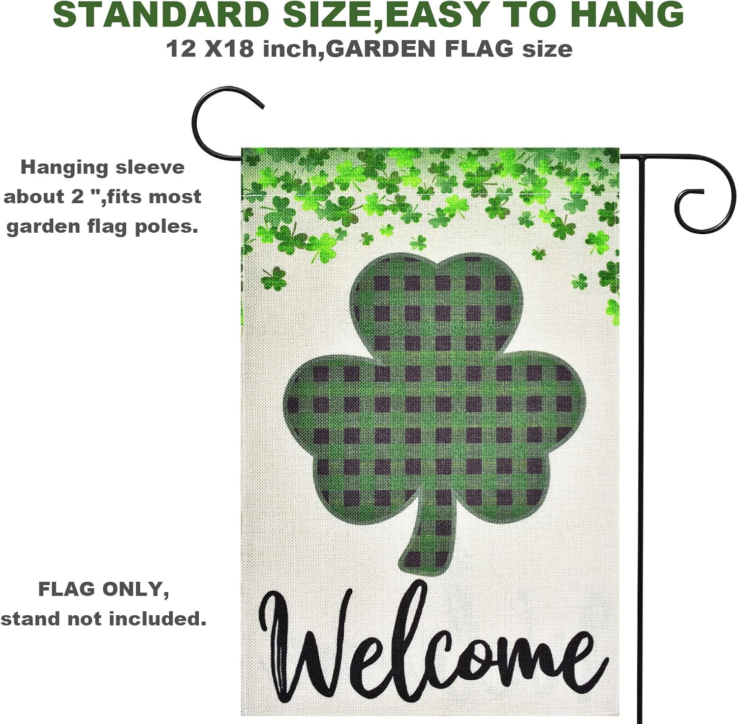 size for visibility without overwhelming your garden space. Double-Sided Green Shamrock Outdoor Decor - This garden flag features the festive Irish clover design on both sides, ensuring the welcoming message is visible from any angle. It's a delightful way to greet guests and celebrate the spirit of St. Patrick's Day in your outdoor space. Easy to Install - Designed with a sleeve at the top, this flag can be easily mounted on any standard garden flag pole or stand, allowing for a hassle-free setup. Slide it onto your flag holder and transform your garden into a place of celebration. Note: FLAG POLE IS NOT INCLUDED. Festive Irish Clover Holiday Yard Flag - With its bold 'Welcome' inscription and shamrock design, this flag is not just a decoration but an emblem of hospitality. It's an ideal addition to any home patio or party setup, ready to infuse your surroundings with Irish charm. Outdoor Decor for Home Patio Party Supplies - This St. Patrick's Day flag is not only for the holiday but also suits any occasion where you want to display Irish pride or simply add a splash of green to your decor. Its sturdy construction and timeless design make it a lasting addition to your festive supplies. Product Description Green Shamrock The vibrant green shamrock against a contrasting background invites warmth and cheer. Easy to Install With a sleeve at the top, this flag easily mounts on any standard garden pole or stand. High-Quality Flag This durable fabric flag withstands outdoor elements, retaining