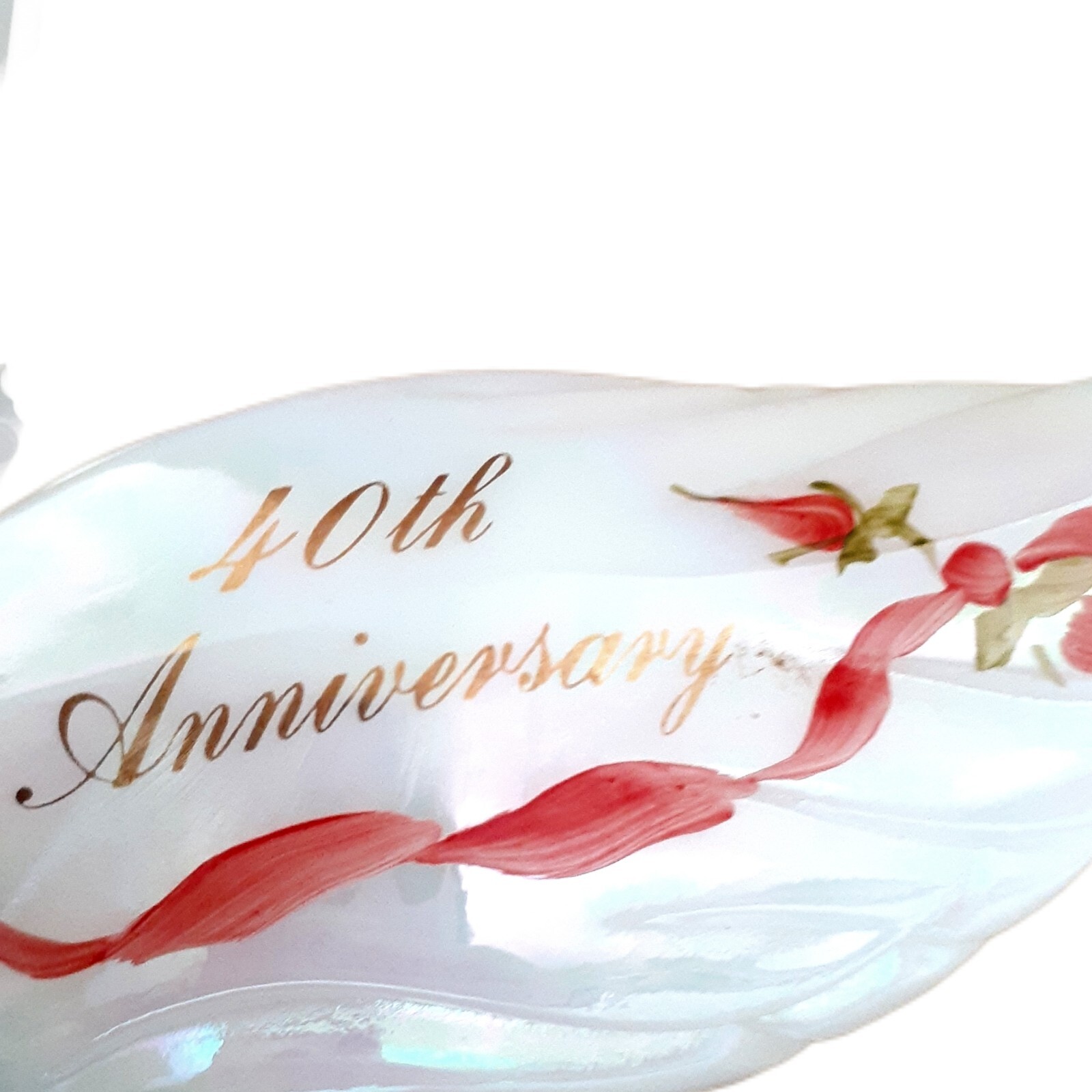 Fenton Swan Opalescent Art Glass Signed Cutshaw Hand Painted 40th Anniversary. Fenton Swan Opalescent Milk Glass Signed D. Cutshaw Handpainted beautiful red roses and ribbons Gold Handwriting, Leaves, and Handpainted by D. Cutshaw Pink Eyes and Beak Used. In good condition. No visible chips or cracks.