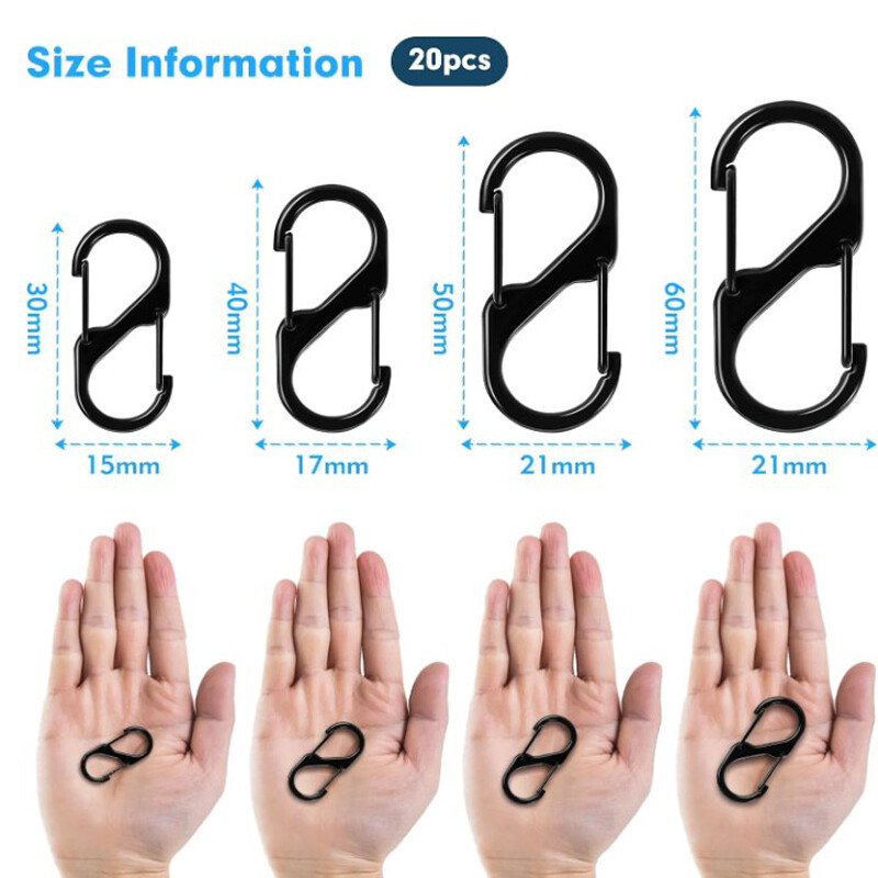 20pcs S Small Carabiner Keyring Clip, 4 Sizes Multipack S Shape Dual Spring Clip Features: Shape large, full of material. Unlike traditional quickdraw with lock design by spring wire additions on both sides of the plastic slider, fixed by sliding up and down. Allows you to mount things more safe and effective anti-theft. Made of high quality, weather-resistant stainless steel, this ultra-handy accessory with its dual spring gates will hold, secure, and connect everything from house keys and cell phones to technical camping gear. Attach valuables to the center bar for ultimate security, link gate ends to a second set of items and anchor, or connect many items together. Excellent for connecting two zipper sliders on backpacks, duffels, and suitcases. The Micro Lock is the perfect