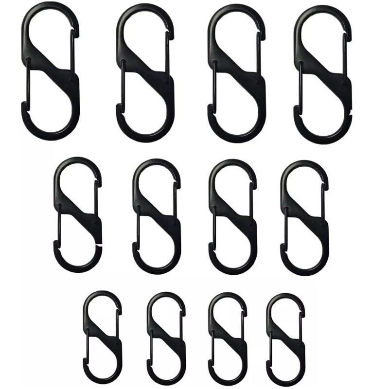 size to hold and organize keys to rings or for organizing other smaller items. And now, with its added twist lever, it also locks perfectly, preventing any unintended or accidental openings. Made of high quality stainless steel, the Micro Lock features a center lever made of durable plastic--a simple twist effectively and securely locks the gates, and keeps them that way until you twist it open again. Great for removing a single key from a ring to take on a run or ride, give to your mechanic, or leave for a friend. The Micro Lock is versatile, convenient, and ultra-secure. Specification: Material: Stainless steel. Color: Black Size: As the pIcture Package Included: 20pcs*S Type Carabiner (30/40/50/60mm 5 pieces per size) NO Retail Box. Packed Safely in Bubble Bag.
