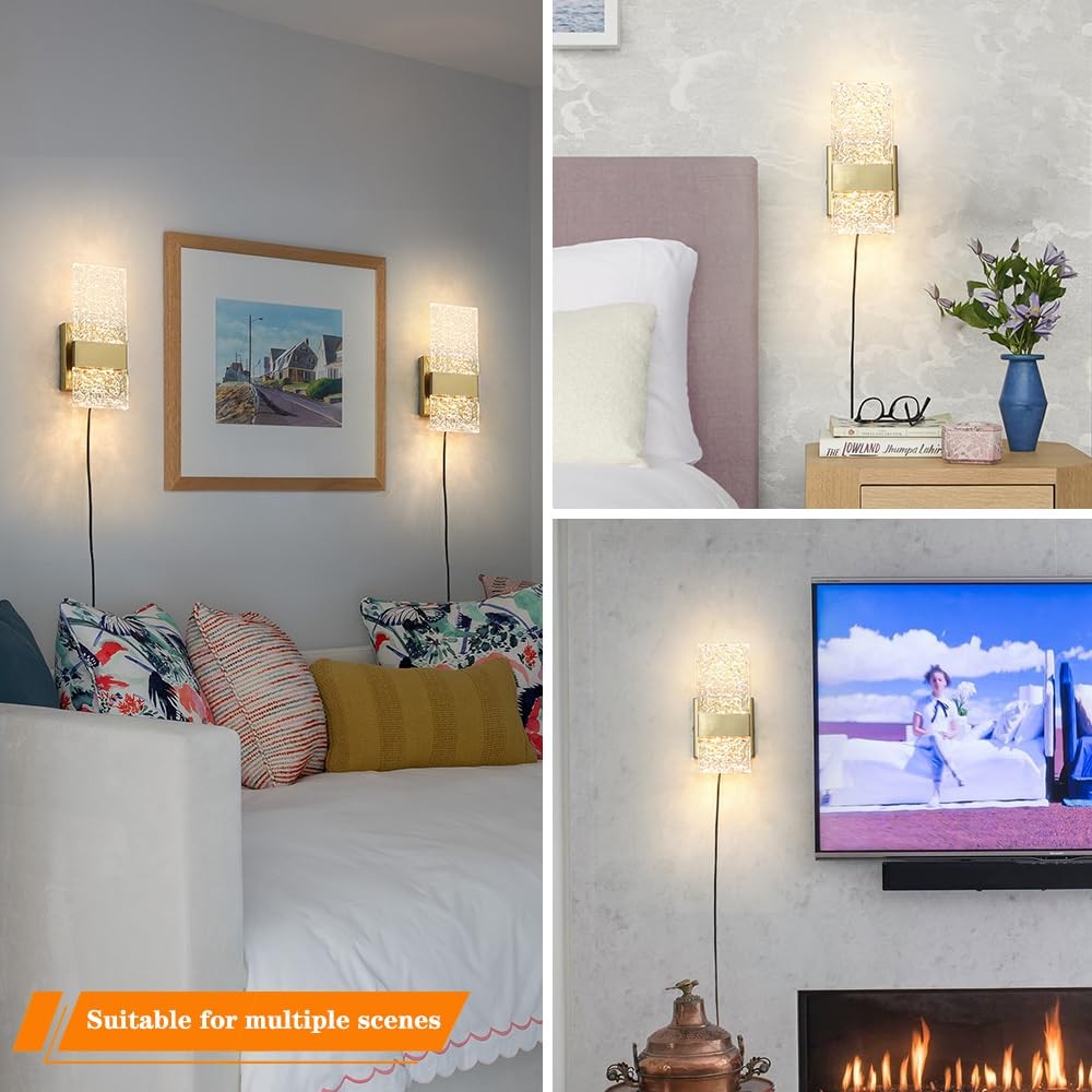 Product Description Upgrade Your Home with ’s Plug-in Wall Sconces Why Trust Us? With 20 years of lighting expertise, delivers plug-in sconces that blend style, safety, and smart features – no certifications needed, just proven performance. Key Features ✅ Rigorous In-House Testing - 6W LED module (60W equivalent) passes 10,000+ durability cycles ✅ Space-Smart Design - 9.25"H x 4.33"W fits narrow walls; 6ft cord reaches awkward outlets Scenarios & Solutions Bedside Companion 3000K dim-to-sleep mode + 4H auto-off = no more forgotten lights Vanity Essential 5000K true-tone lighting reveals flawless makeup blending Midnight Saver Remote-controlled 10% dimness for baby checks without glare Specifications ▸ Warranty: 1-year full coverage (defects/replacements) ▸ Materials: Reinforced brass gold + shatterproof acrylic【Customizable Light】The brass gold wall lamps are 5%-100% dimmable (Not fit for wall dimmer)for allowing you to find the ideal light for every occasion. With 3CCT changeable(3000K-4000K-5000K) function, you can choose light