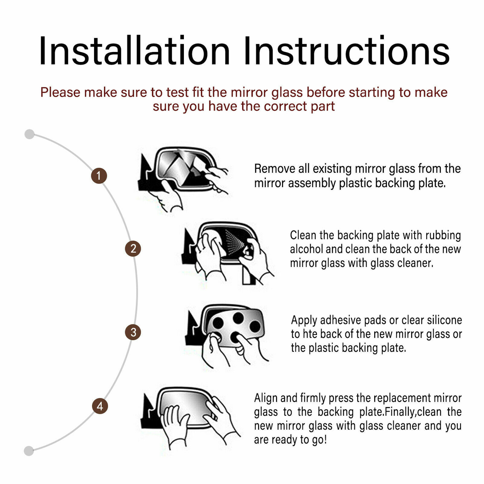 size of the mirror.This helps ensure you are ordering the correct part.If you have any questions, please contact us first and we will help you solve it.Installation Steps:Please make sure to test fit the mirror glass before starting to make sure you have the correct part. 1. Remove all existing mirror glass from the mirror assembly plastic backing plate. 2. Clean the backing plate with rubbing alcohol and clean the back of the new mirror glass with glass cleaner. 3. Apply adhesive pads or clear silicone to the back of the new mirror glass or the plastic backing plate. 4. Align and firmly press the replacement mirror glass to the backing plate.Clean the new mirror glass with glass cleaner and you are ready to go!shipping form USAPayment:PayPal is our preferred method of payment for all of our eBay sales. For customer service please contact us via eBay Messages.Immediate payment via PayPal is required for all Buy It Now items. For all Best Offers, payment is required within 3 days.Return:Returns will be accepted within 60 days of the receipt of the item.If The Item Shows Up Defective or Broken, Please contact us and we will give you the solution.If you want to return the item, please contact customer service for RMA# (Return Merchandise authorization).The returned package(s) must be in original package with all packaging material.Please be sure to notify us of your return tracking number upon shipping your item back.contact usWe strive for 100% customer satisfaction! Positive Feedback is very important to us. If you have any questions, please feel free to contact us via "Ask seller a question" . We will reply your email within 24 working hours.