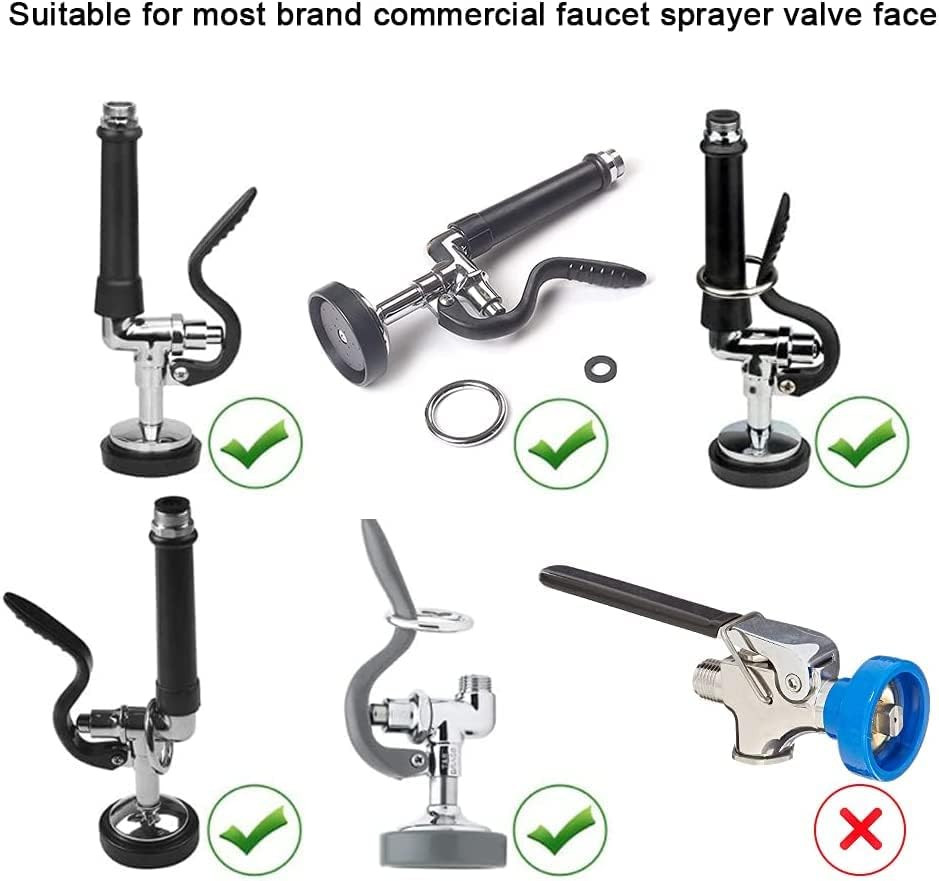 size before ordering, make sure it suits you. [The 304 stainless screw included]Rinse Unit Repair is with 1.42 GPM, water output effect is better than other products, 16 through holes concentration streams for any washing and cleaning task.To achieve the best quality at a reliable price, we use thermoplastic materials. Thermoplastics have safety, bending resistance, durability, heat resistance, and best performance.Just change these parts to save money and increase your faucet lifespan, easy to DIY replacement, with just one screwdriver that is enough, and installs finish 1 minute enough.Suitable for most brand commercial faucet sprayer valve face, such as JZ, MS, KOLLNIUN, COOLWEST, KWODE, and TS. If you have any questions you need to consult, you can contact us at any time. Product Description KANONEY Spray Valve Repair Kit is designed for all most commercial faucet sprayer replacement parts, saving much money and avoid waste. Why Choose KANONEY? Easy to a DIY replacement, just one tool that enough, install finish just 1 minute enough. Commercial Sink Sprayer Repair Kit Specification Product Name: Black Pre Rinse Spray Repair Kit Diameter size: 2.08 inch Spray face holes: 16 Water flow: 1.42GPM Function Kitchen the water into a point for dishwashing disks Package Included 2* Spray Face 2* Bumper 2* Stainless Screw