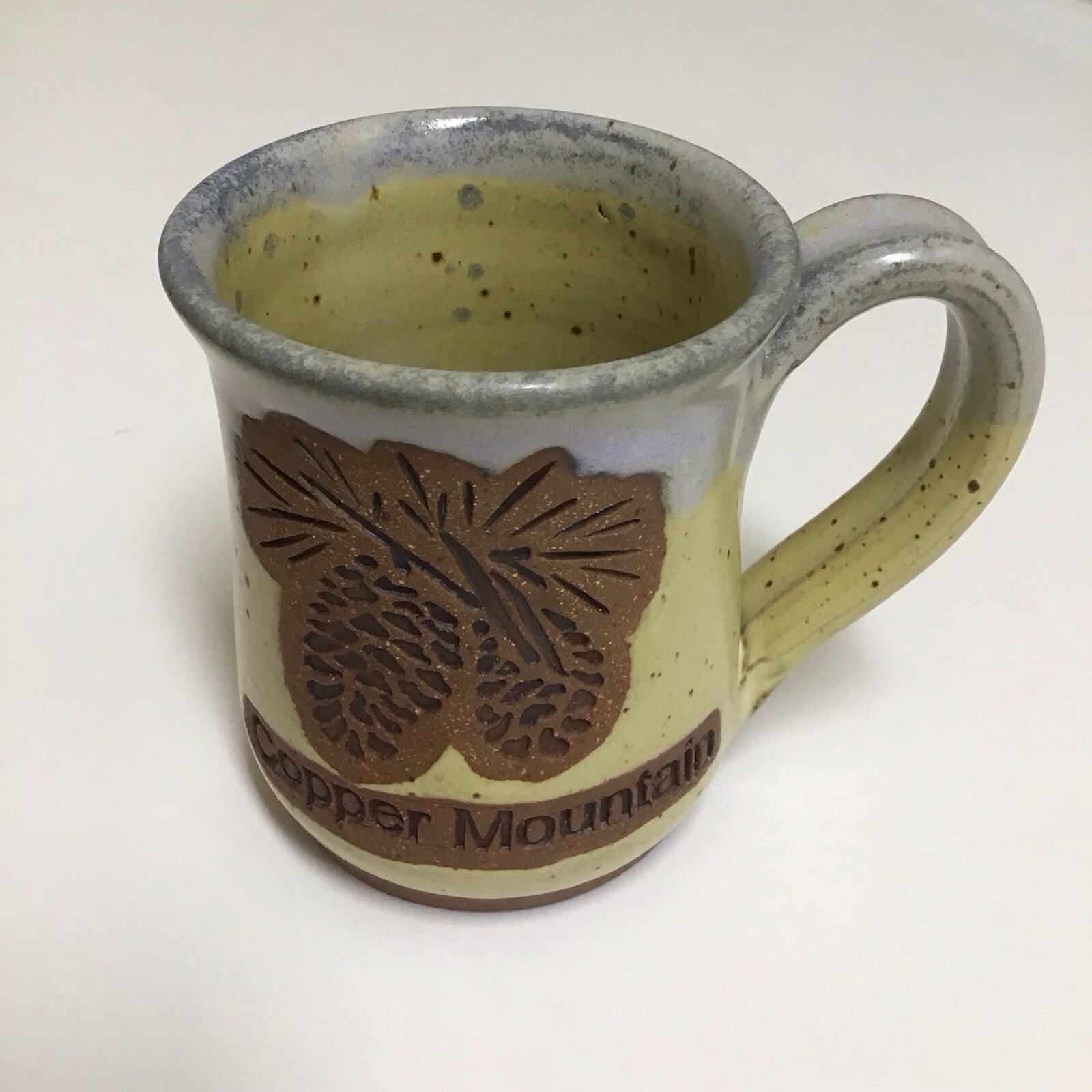Copper Mountain Studio Pottery Coffee Mug Charlotte Lee Signed Pinecones Ski CONew without tags. Really nice speckled stoneware mug measures approx. 3 1/4” diam at rim and 4” tall.Lovely colors from C.Lee studio, Colorado Springs, Colorado.